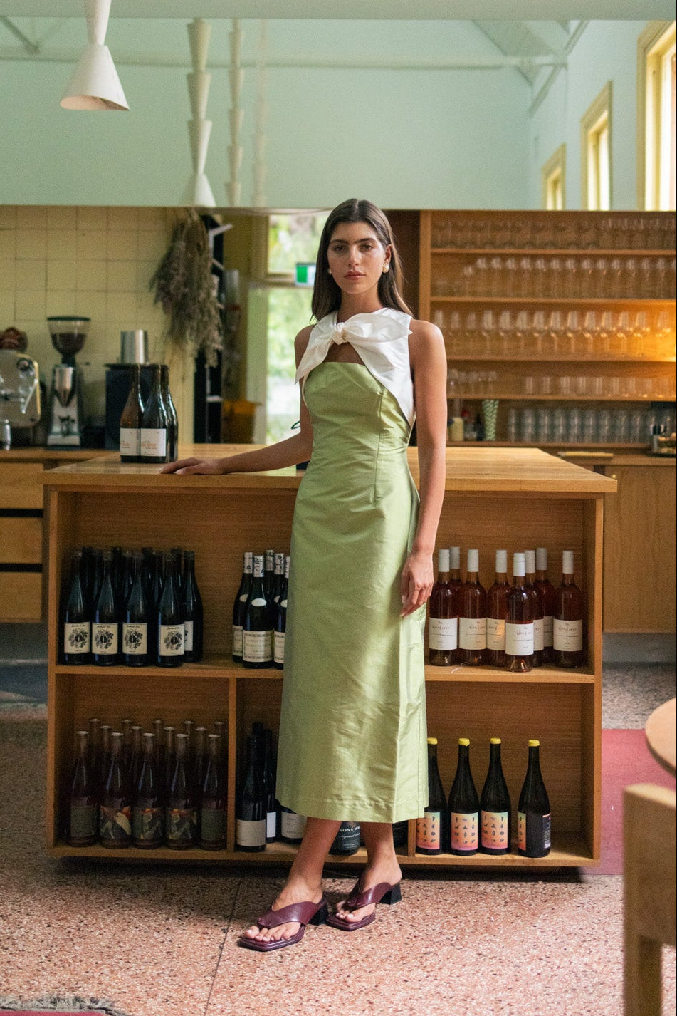 The Charlotte midi dress in olive is an elegant silhouette elevated with a statement bow detail at the neckline. Crafted from a structured recycled taffeta blend, this dress exudes modern sophistication with its clean lines and subtle sheen, making it a versatile choice for both day and evening occasions.