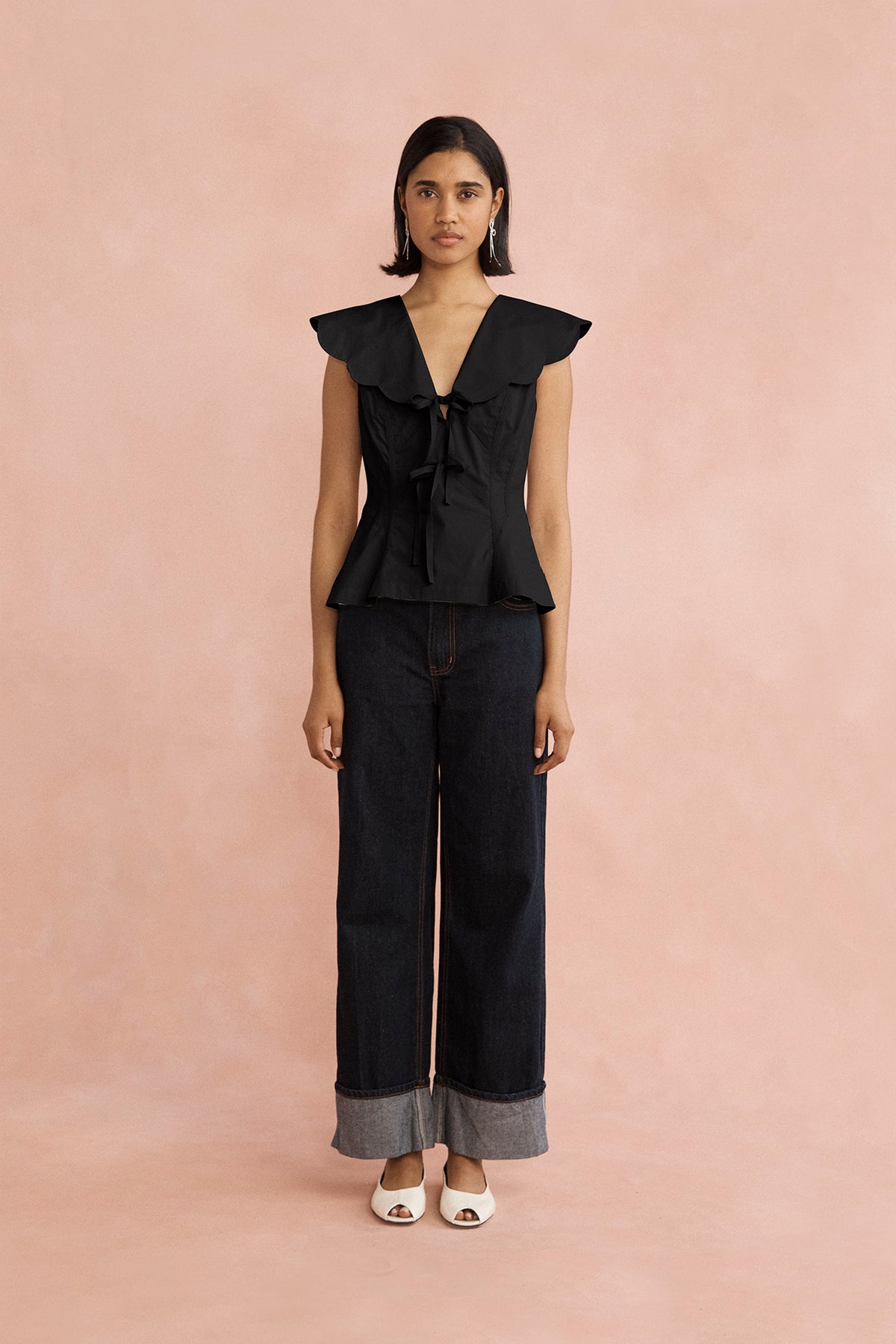 The Rhia Top is reimagined in ink cotton poplin for a refined, romantic feel. Featuring soft grosgrain ribbon bows, a vintage-inspired Puritan collar, and gentle waist shaping, it creates a flattering, timeless silhouette. Versatile and elegant, the Rhia transitions effortlessly from day to night.