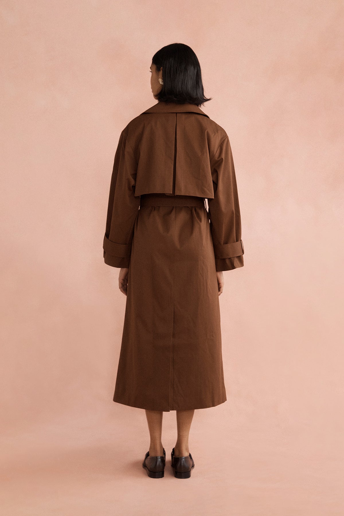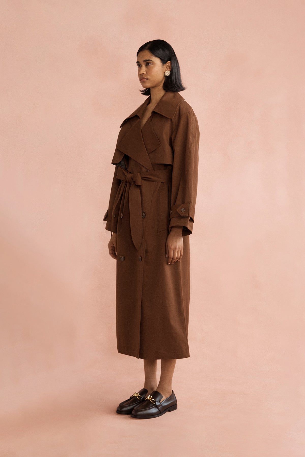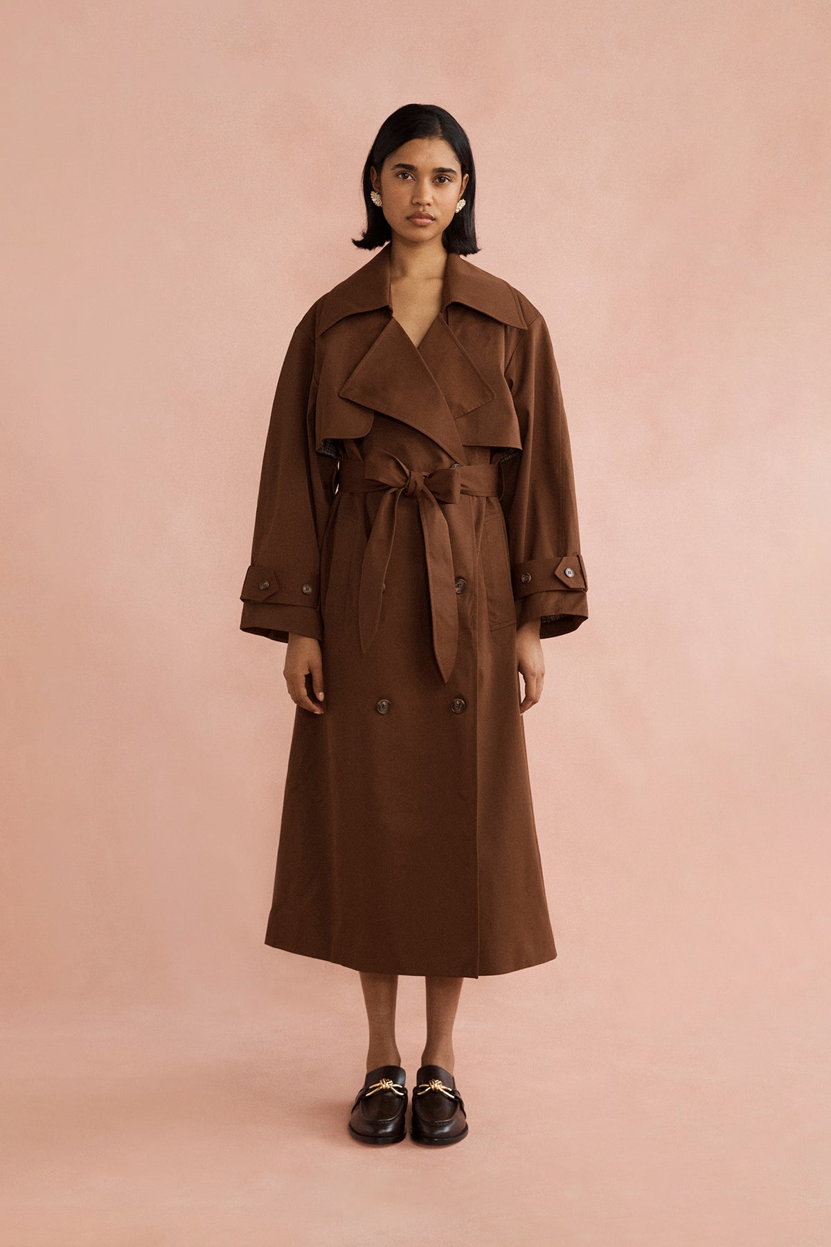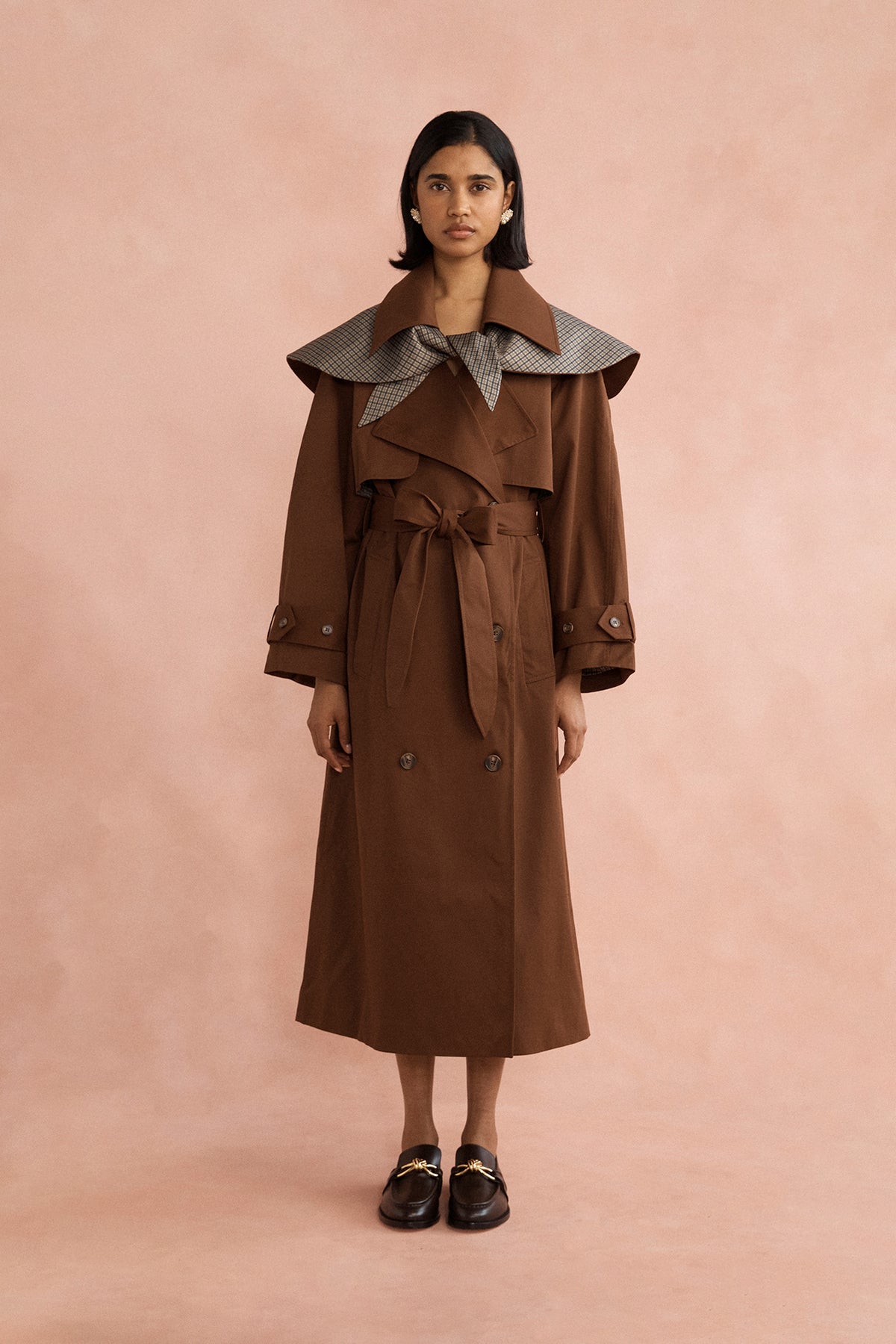 Introducing the Alexandra trench in cacao, a refined reinterpretation of the classic trench silhouette imbued with timeless Lovaan elegance. Designed with an exaggerated double-sided collar and an oversized self-tie bow, this statement piece balances structure and femininity with ease. A detachable waist belt cinches the figure, while wide cuffs and a storm flap nod to traditional tailoring. Fully lined in a soft beige check for added warmth and contrast, the Alexandra trench is the ultimate outerwear piece for effortless, elevated dressing.