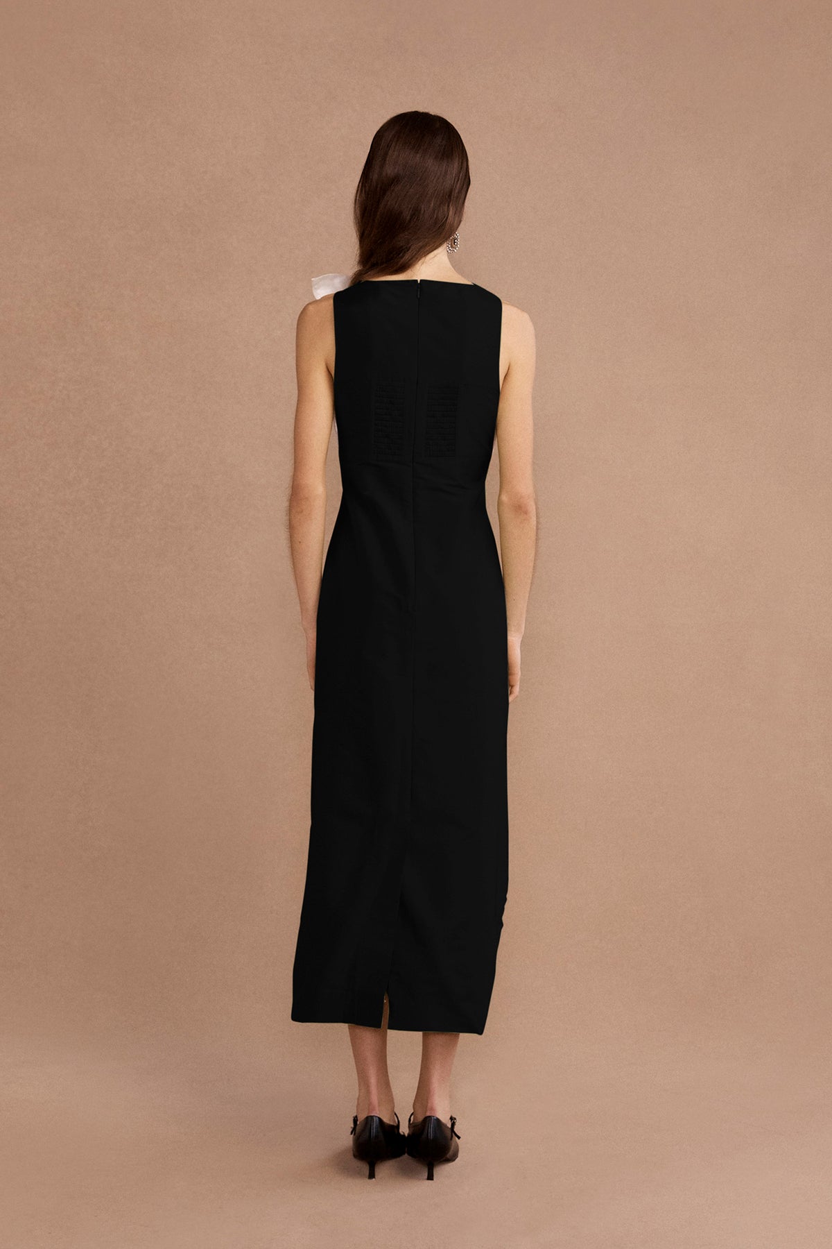 The Charlotte midi dress in black is an elegant silhouette elevated with a statement bow detail at the neckline. Crafted from a structured recycled taffeta blend, this dress exudes modern sophistication with its clean lines and subtle sheen, making it a versatile choice for both day and evening occasions.