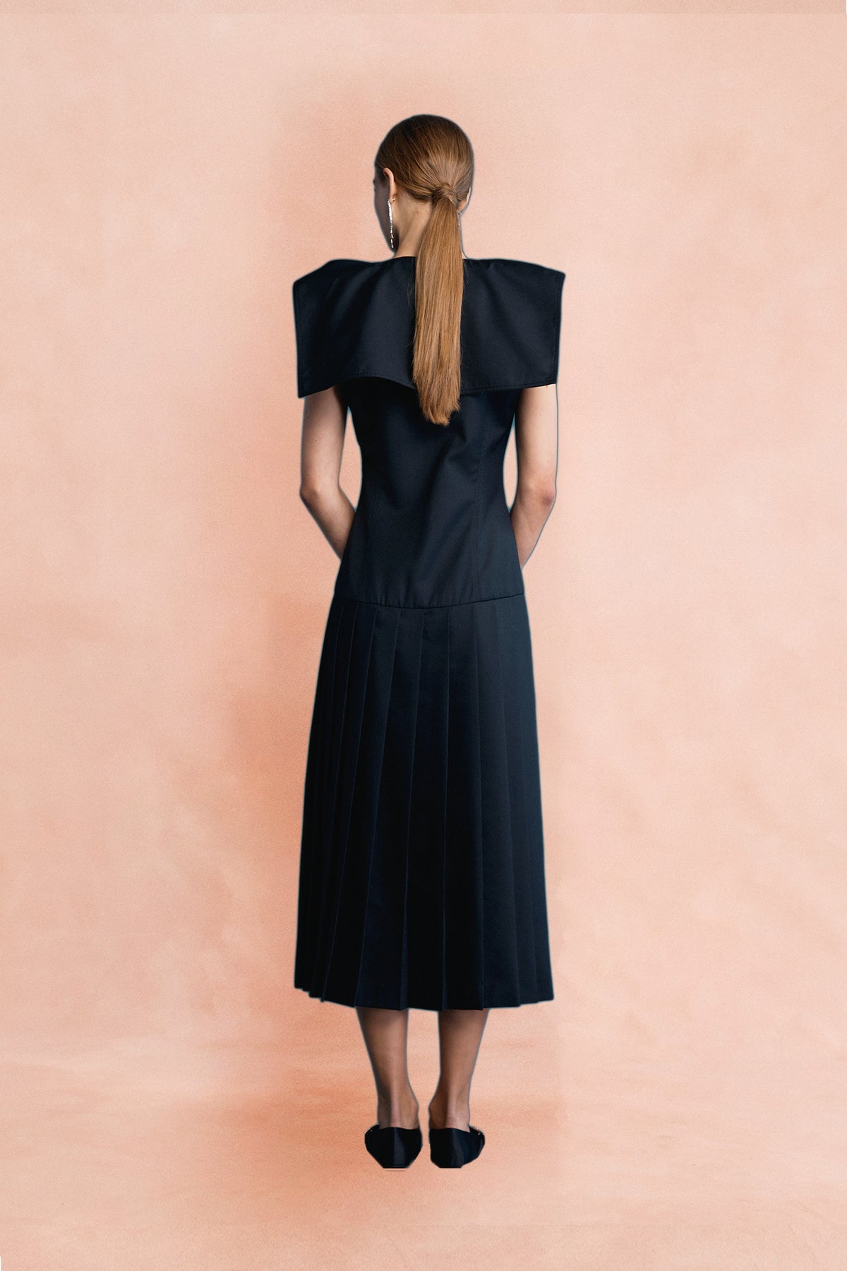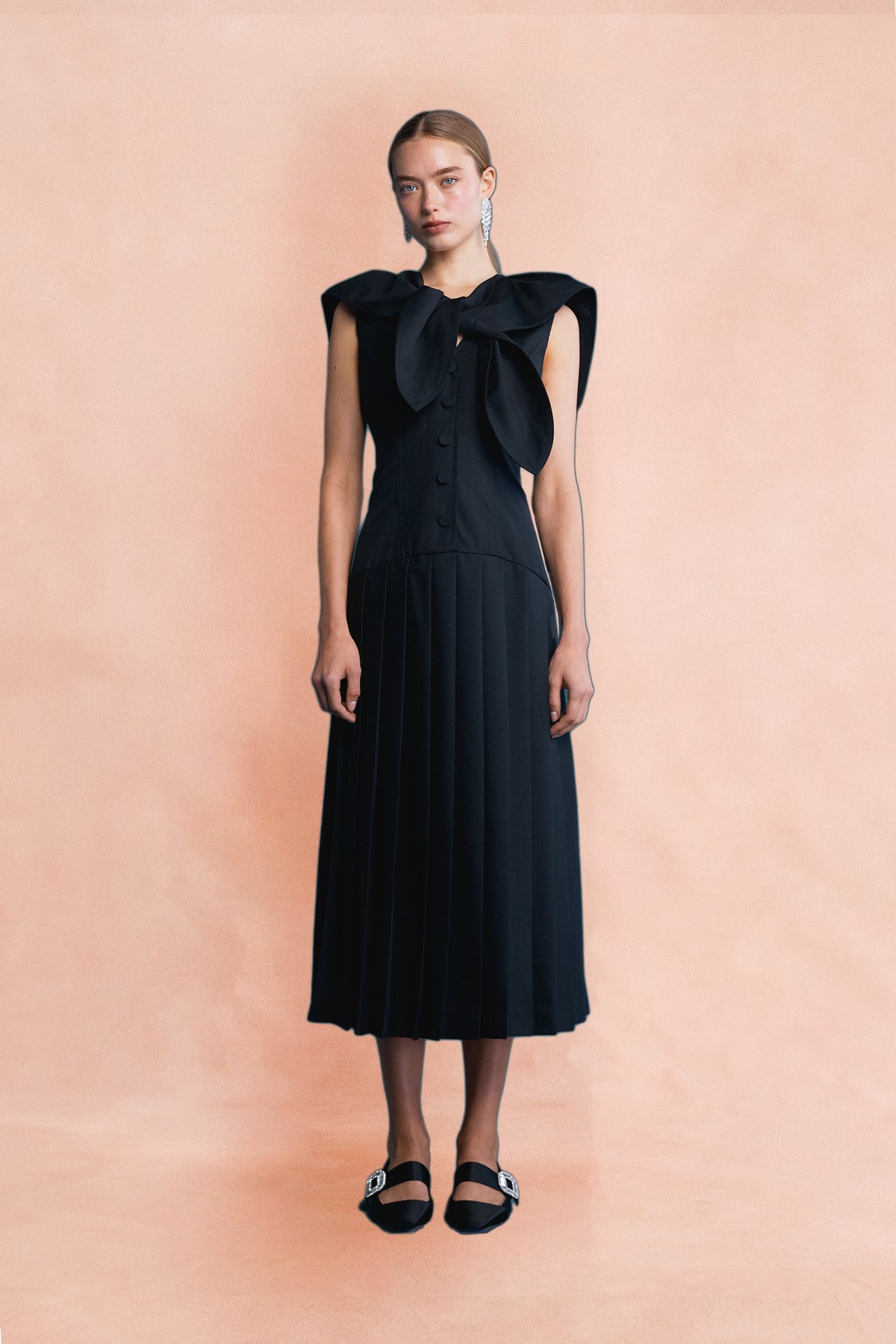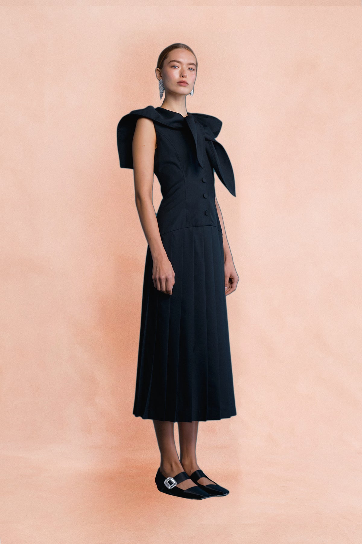 The Elly dress in black is sophisticated and elegant in dress form. It features a fitted bodice with a mock self-covered button front that contours to your shape, and a pleated skirt adds movement and grace. With a drop waist shape to create a modern and effortless shape, the dress comes with a removable neck scarf for versatile styling options.