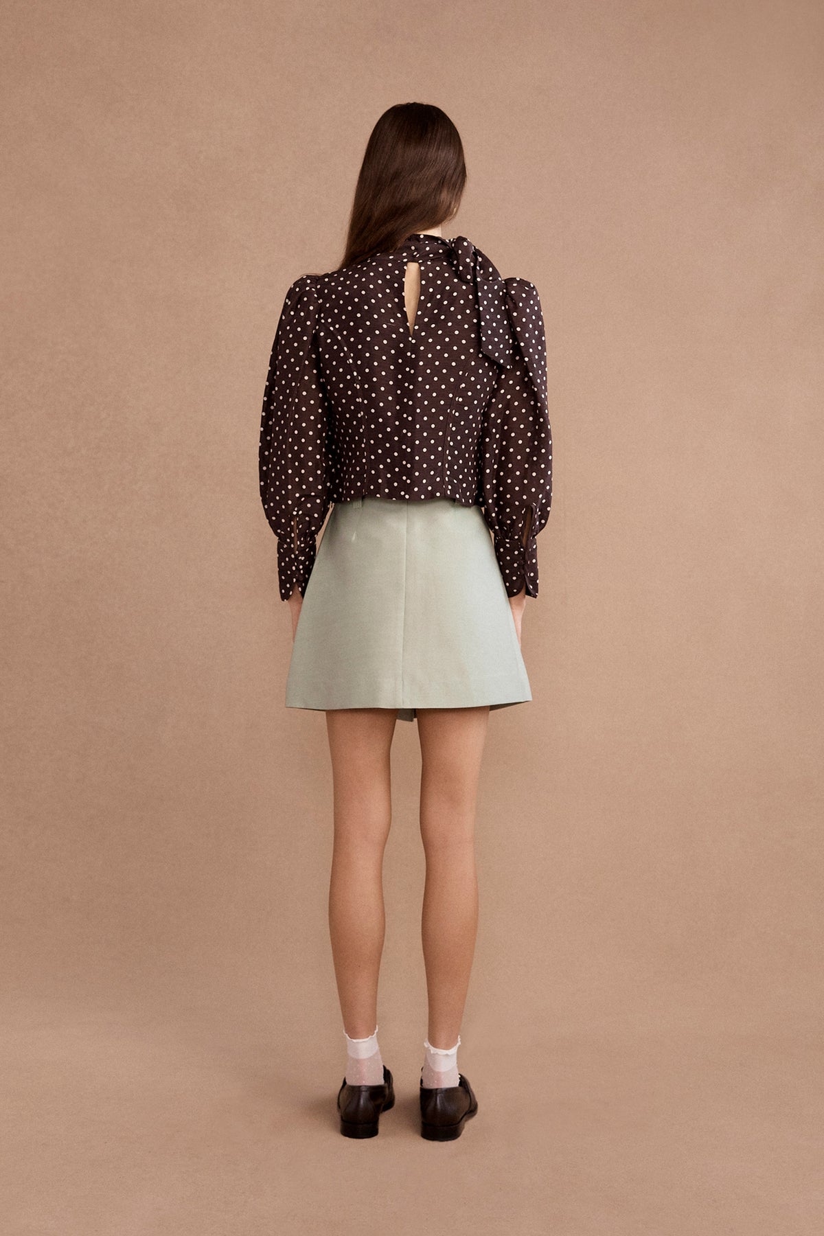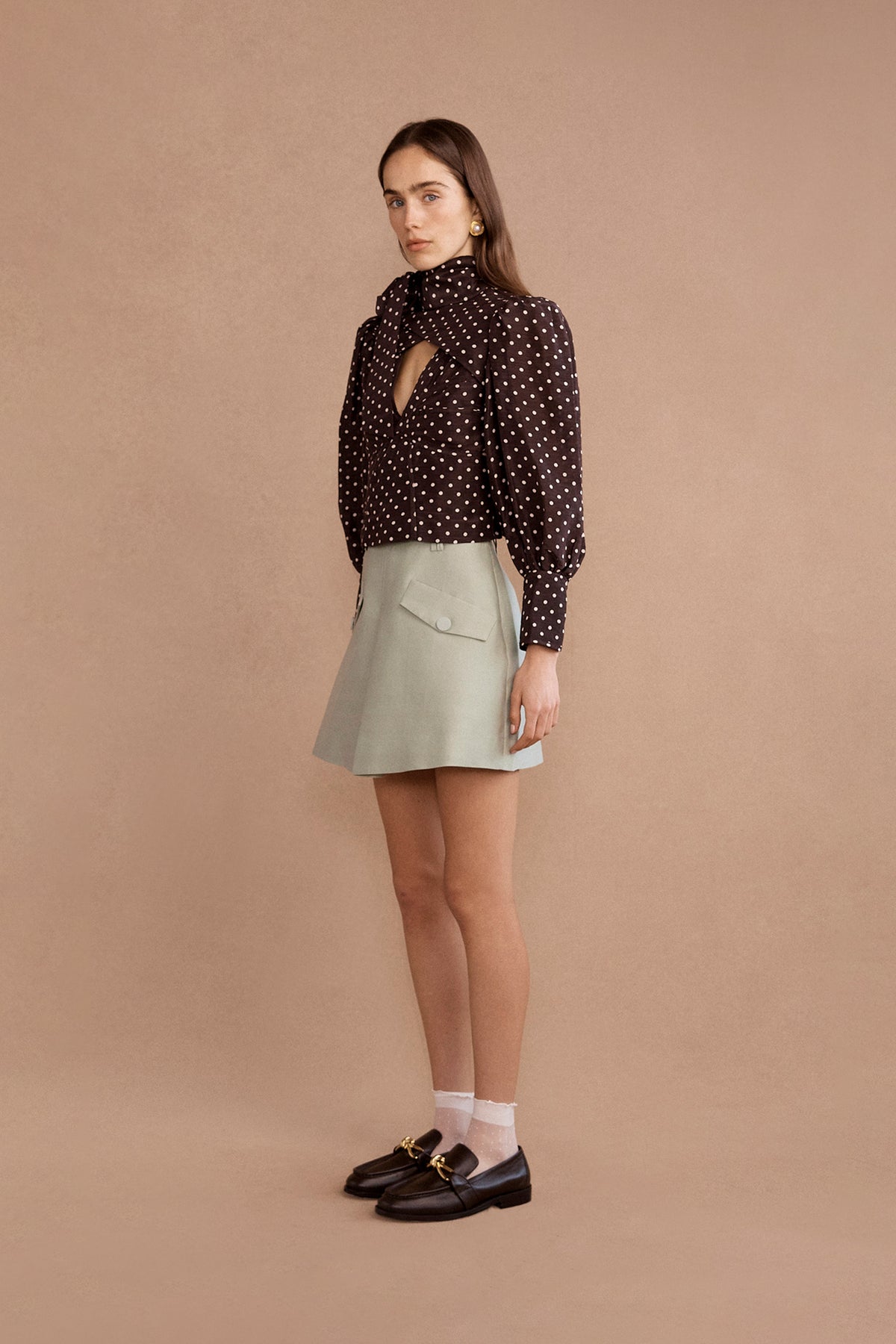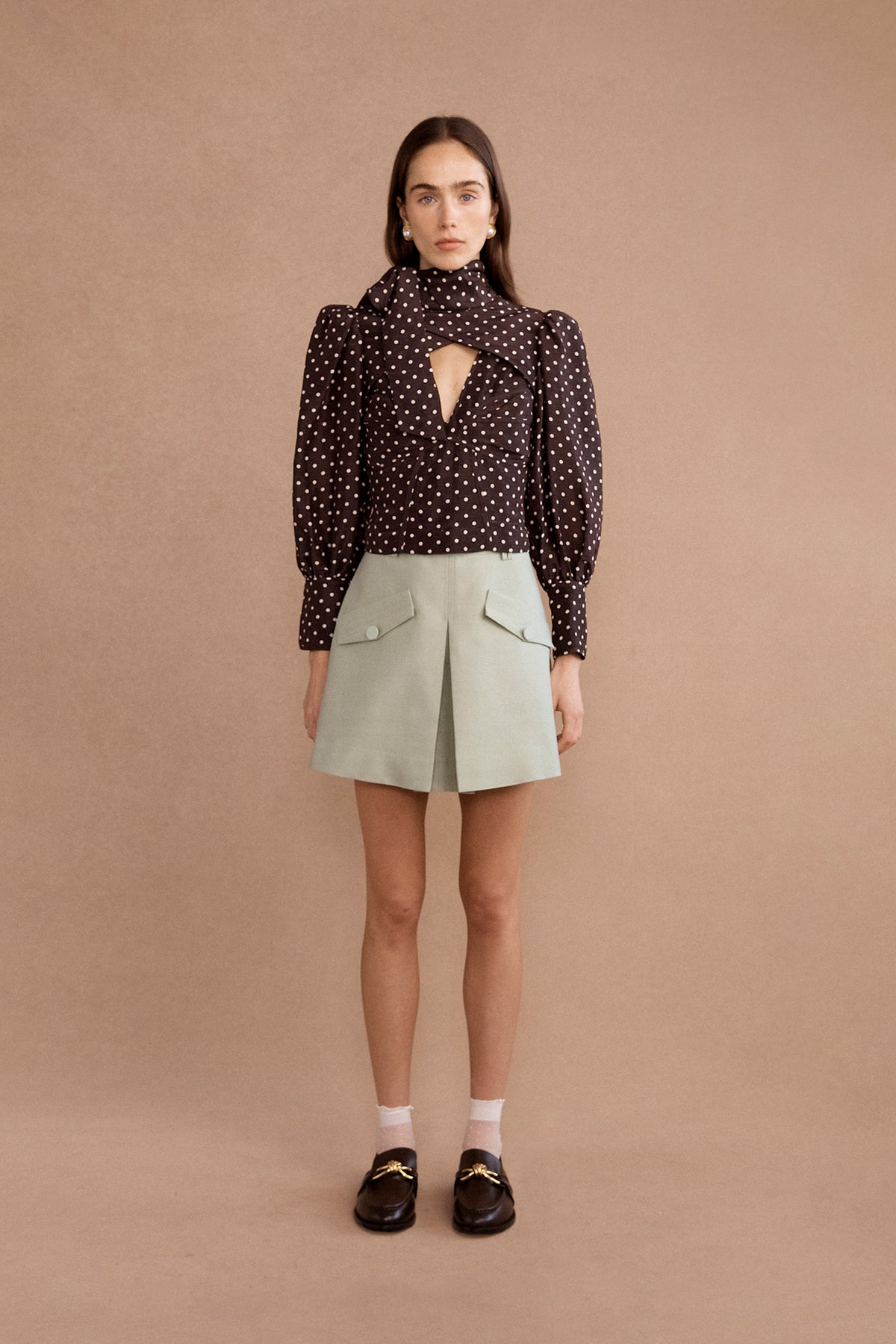 The Joanna Mini Skirt in Laurel is a refined staple with a contemporary edge. Featuring a centre front box pleat and delicate decorative pockets, it offers a soft, fluid drape and a polished finish. The Joanna combines structure with effortless elegance, making it a versatile piece for elevated everyday styling.