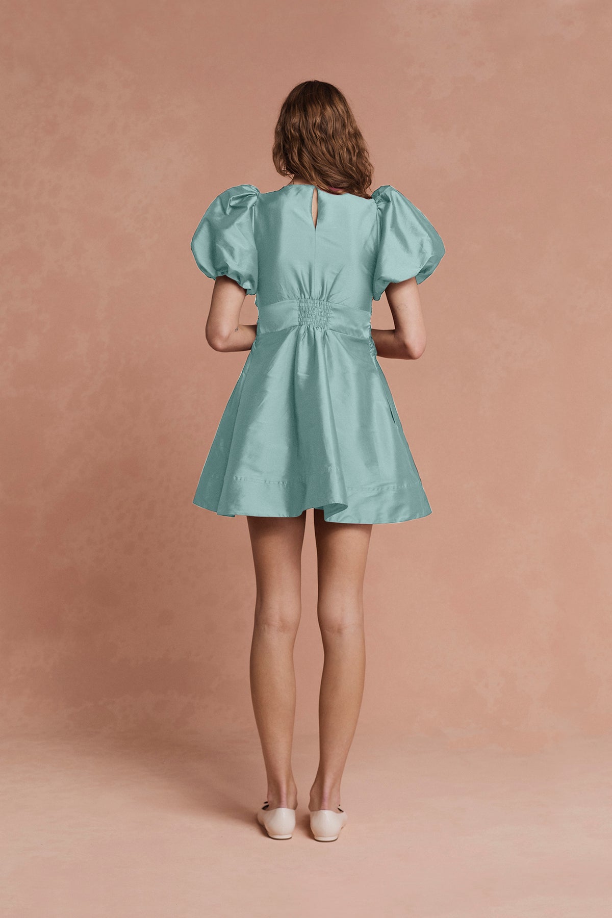 Embodying the essence of playful sophistication, the Iris dress in sage is a striking mini-dress designed to captivate. Crafted from a recycled taffeta blend, this dress features unique cinched gathers through the front bodice that create a bow-like effect, adding sculptural allure to its silhouette. With iconic Lovaan blousy puff sleeves, it strikes the perfect balance between whimsical charm and elevated style.