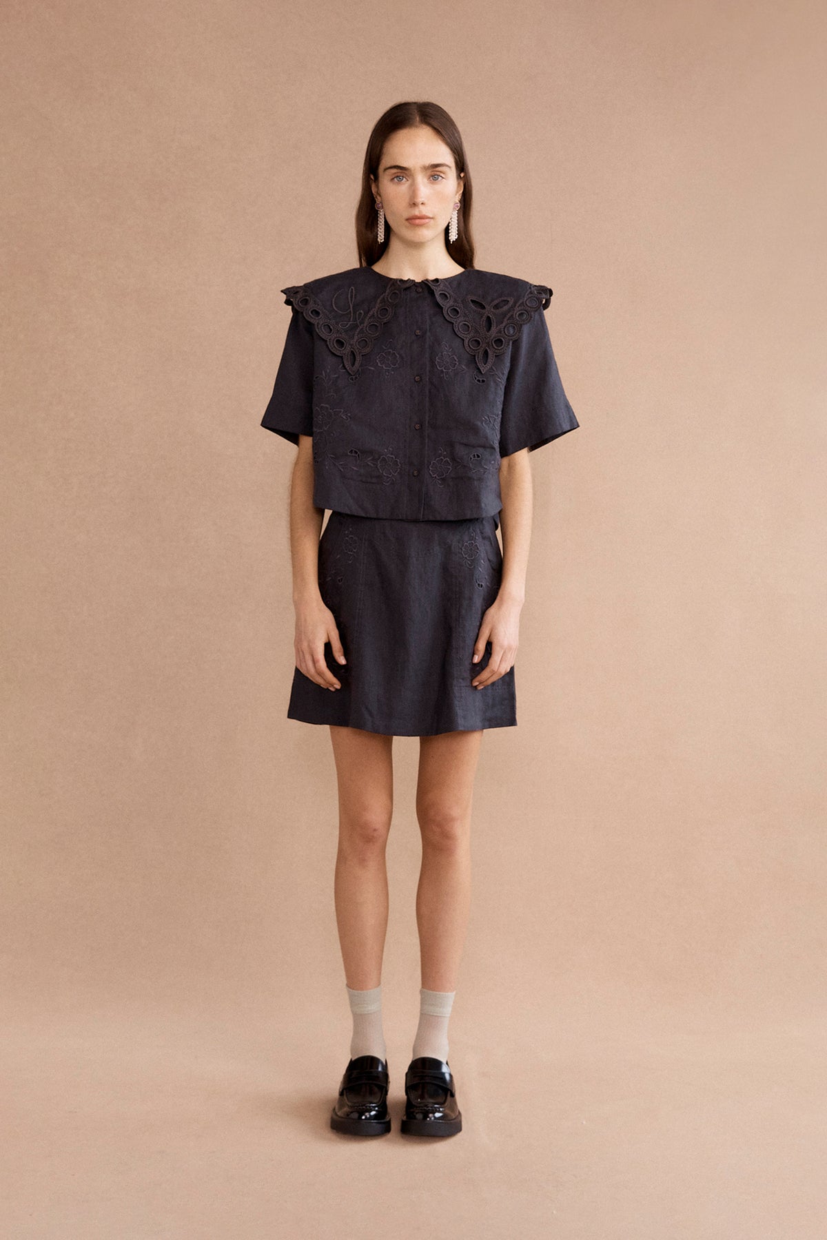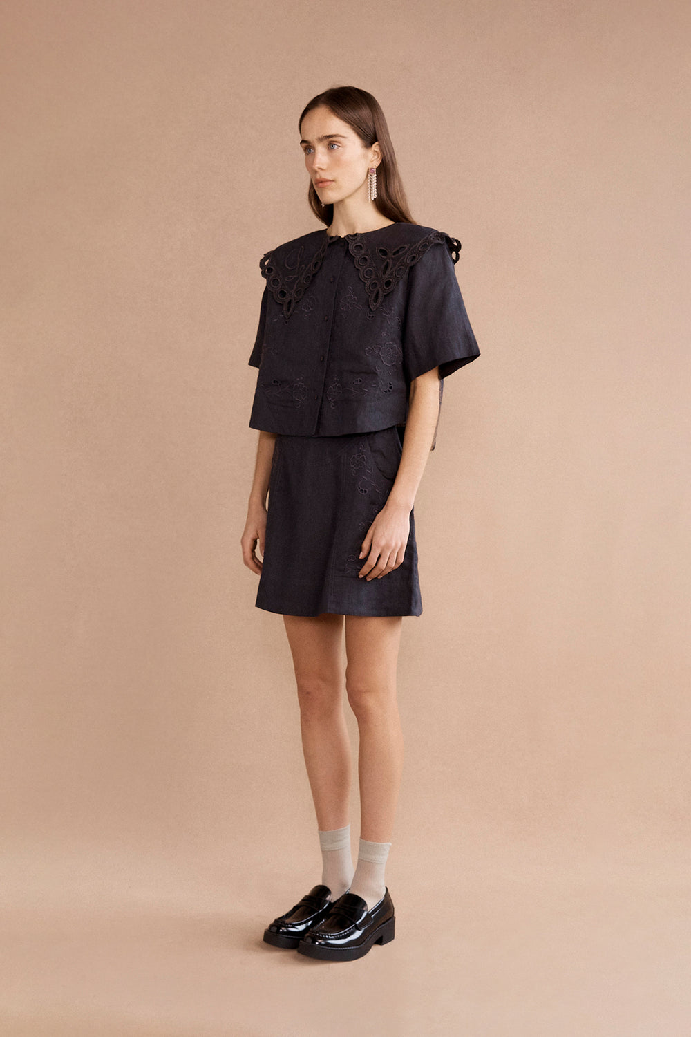 Embrace effortless elegance with the Mary top, evoking vintage tablecloth allure. Crafted from premium black linen with embroidered flowers, its oversized collar adds understated glamour, making this lightweight staple a subtle yet striking piece. Pair it with the matching Nina skirt for all-day comfort and leisurely lunches.