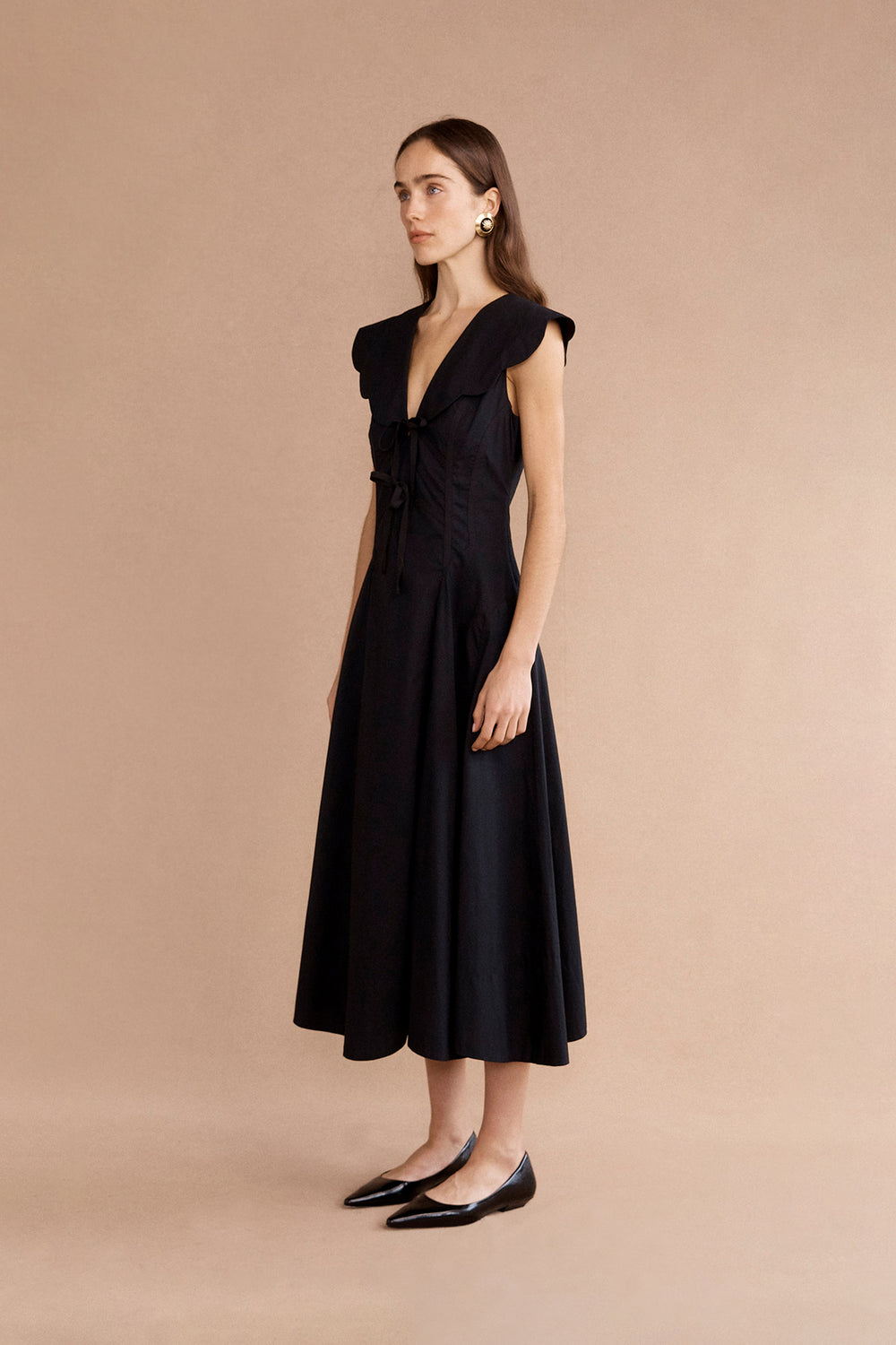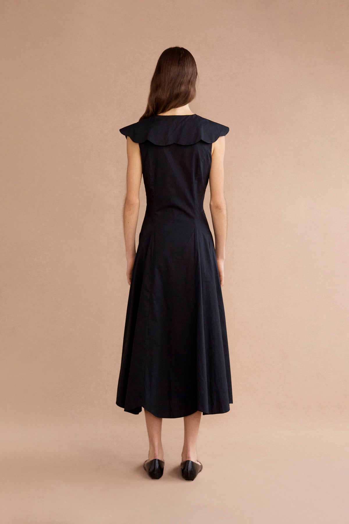 The Rhia midi dress in black is an elegant evolution of a timeless silhouette. Crafted from organic cotton poplin with intricate scalloped edges, it evokes a sense of romantic nostalgia while remaining effortlessly modern. The vintage-inspired Puritan collar and grosgrain ribbon bows at the bodice lend charm and character, while subtle shaping through the waist offers a flattering, feminine fit. Airy and ethereal, this midi-length dress is perfect for long lunches, garden weddings, or evenings under soft light.