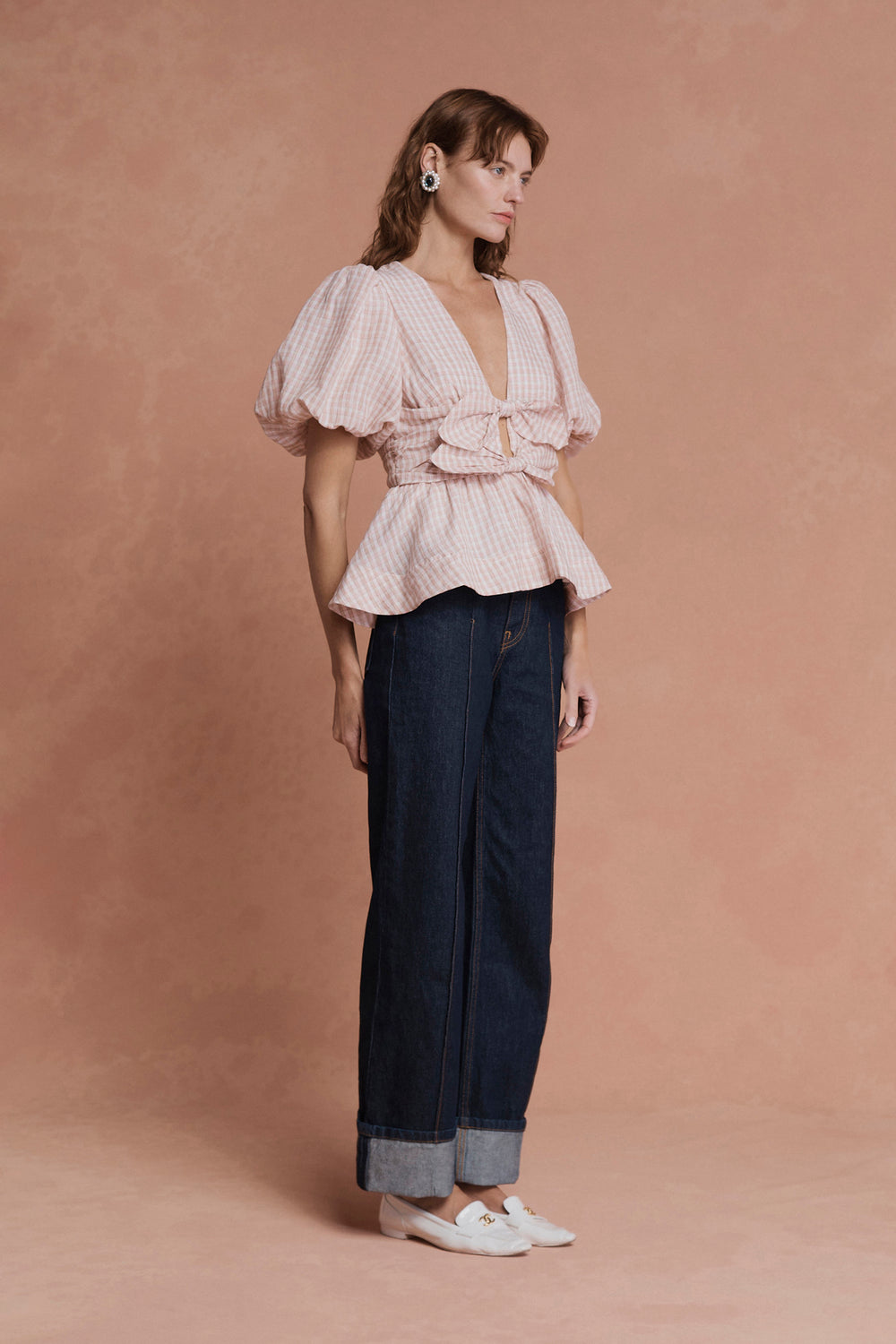The Devon top in pink check is made of a luxurious linen silk blend, featuring double bow front details, blousy puff sleeves and a flattering deep V-front neckline.