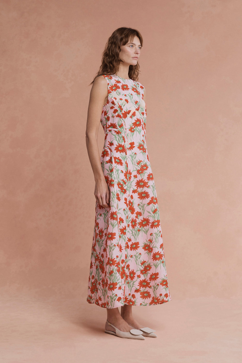 The Pollyanna Midi Dress in Aster Floral is a soft statement piece. Crafted from a premium blend of linen and silk, this sleeveless silhouette features subtle shaping through the bodice, a high round neckline, and a full A-line skirt that falls elegantly to the ankle. The all-over daisy motif makes it a standout option for garden parties, long lunches, or days you just want to feel special.