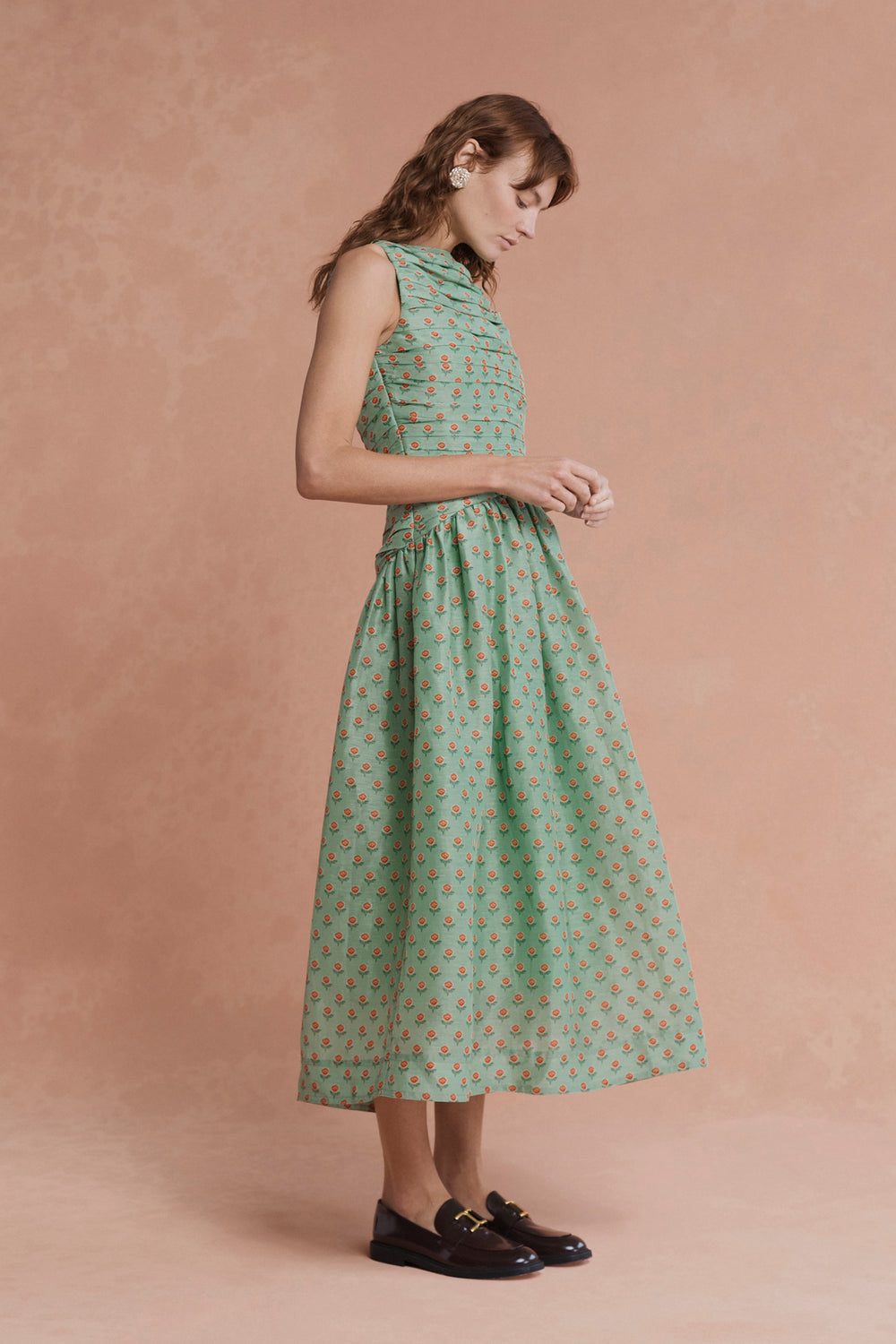 The best party dresses invite unrestricted movement; the Val dress is no exception. Cut from luxurious silk linen in a playful green rose print, its full-length design flatters with ruching through the waist and a softly draped skirt. Just add signature jewellery and a blazer.