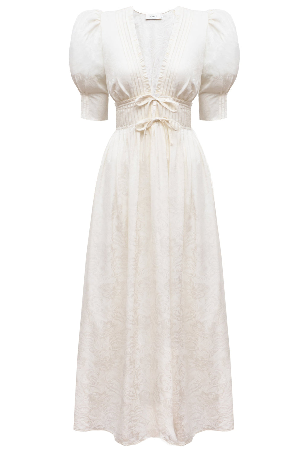 Radiating romance, the Boehm dress in cream jacquard gracefully flatters the figure. Its standout feature lies in the exquisite pin-tucking details on the bodice and cuffs. Style yours with a touch of shimmer.