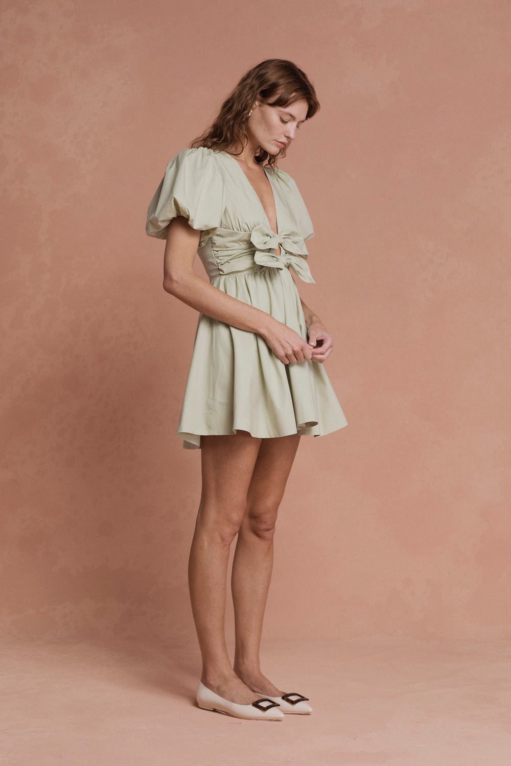 The Devon mini dress in pistachio is made from butter-soft cotton poplin, featuring double bow front details, blousy puff sleeves and a flattering deep V-front neckline.