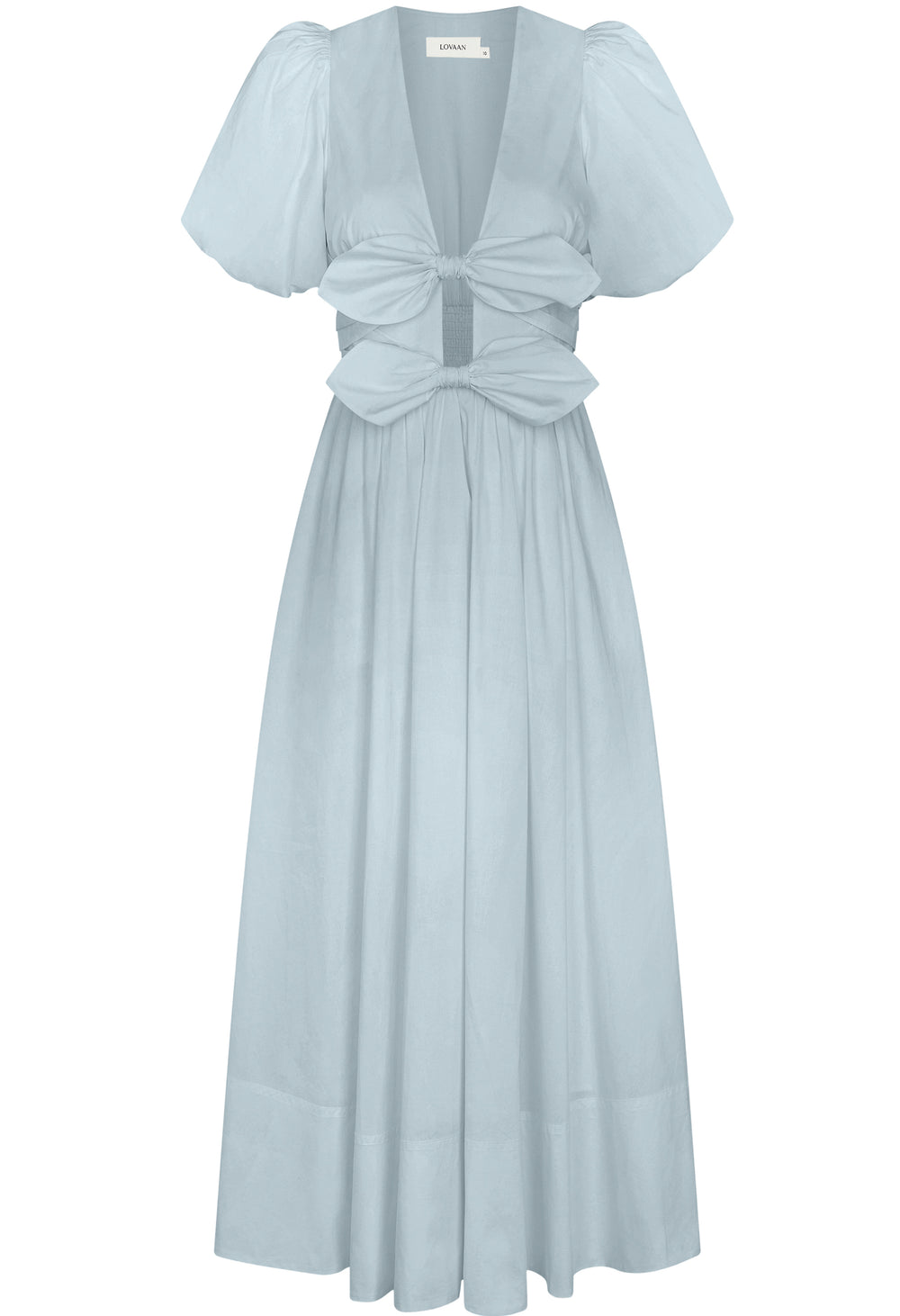 The Devon midi dress in muted blue is made from butter-soft cotton poplin, featuring double bow front details, blousy puff sleeves and a flattering deep V-front neckline.