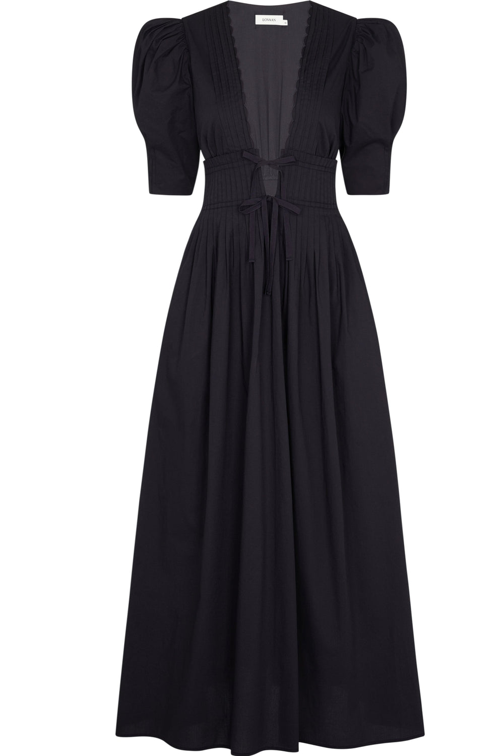 The ankle-grazing Boehm dress in ink is made from luxurious soft cotton poplin. The dress features pin-tucked pleating details, blousy puff sleeves with a fitted pin-tucked cuff, and a double ribbon front detail.
