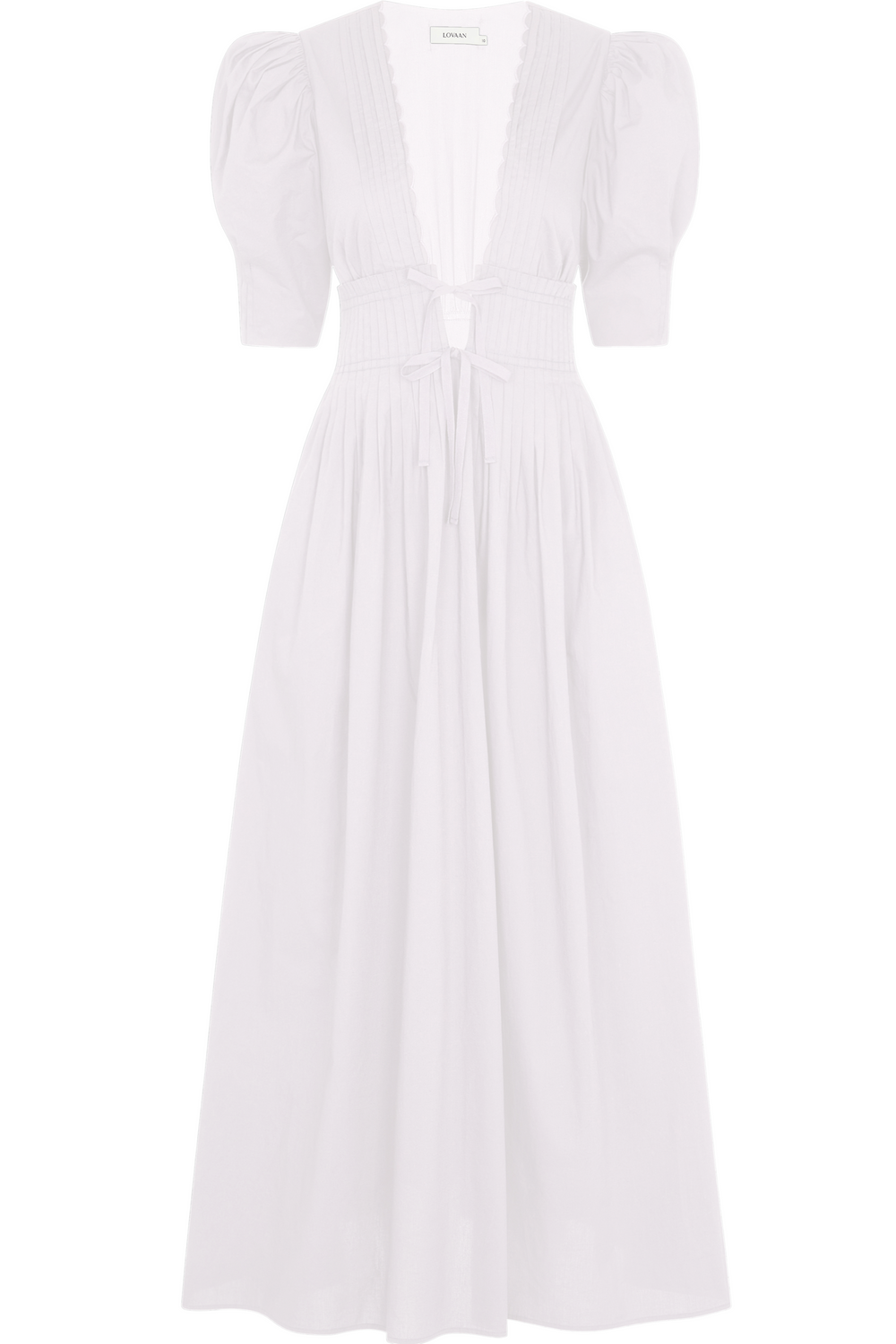 The Boehm dress in white is made from luxurious soft cotton poplin. Featuring pin-tucked pleating details, blousy puff sleeves with a fitted pin-tucked cuff, and a double ribbon front detail.