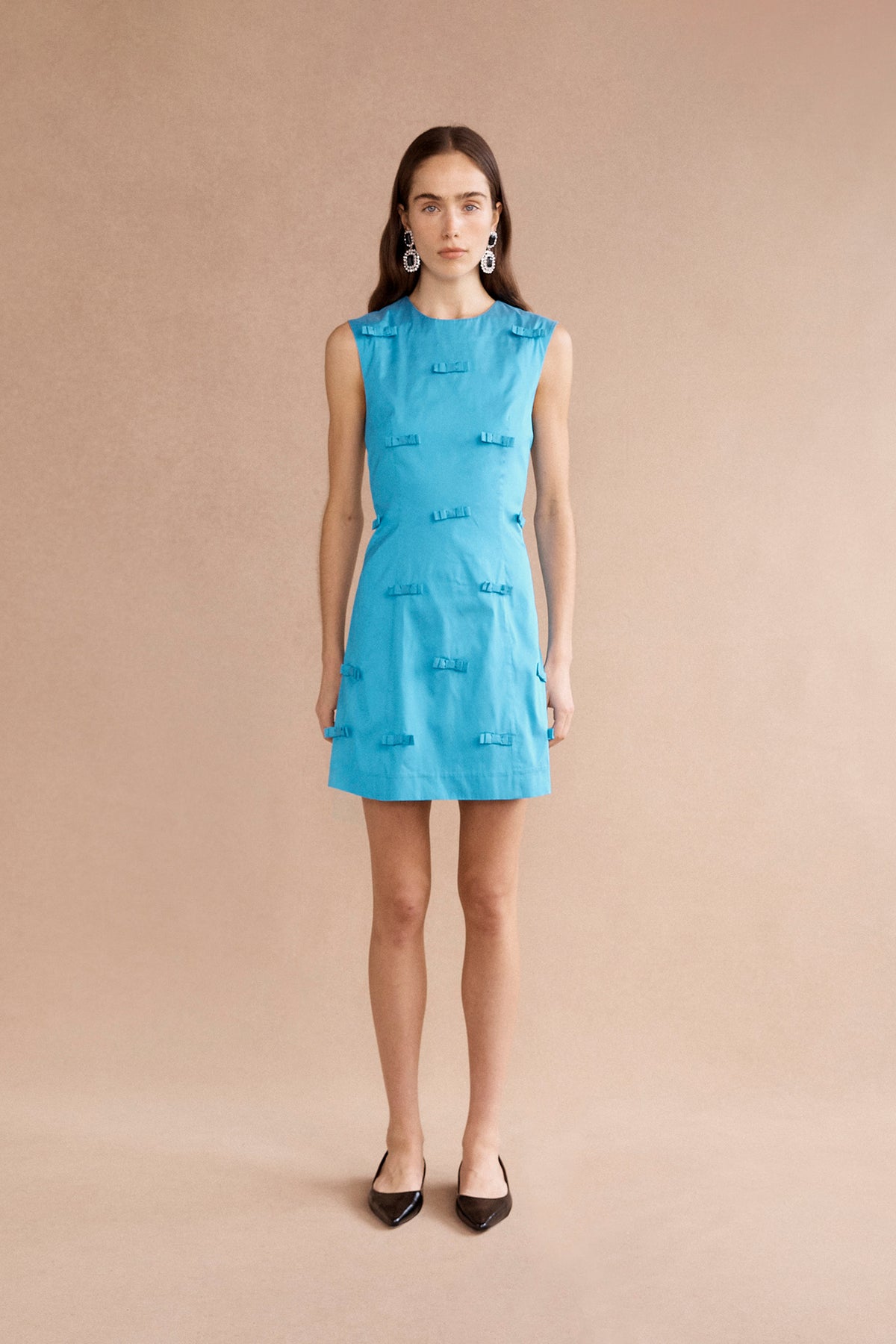 Introducing the Helena mini dress in Electric blue , a romantic and elegant take on a classic Lovaan silhouette. This enchanting dress features delicate bows adorning the surface of the fabric, adding a whimsical charm that captures the eye.