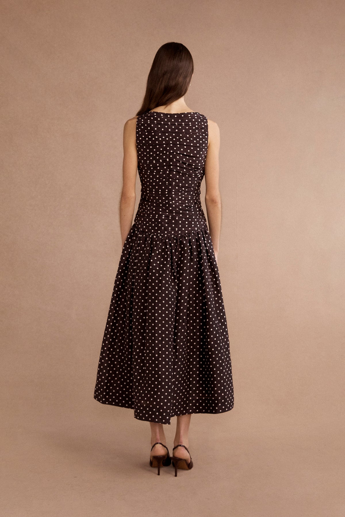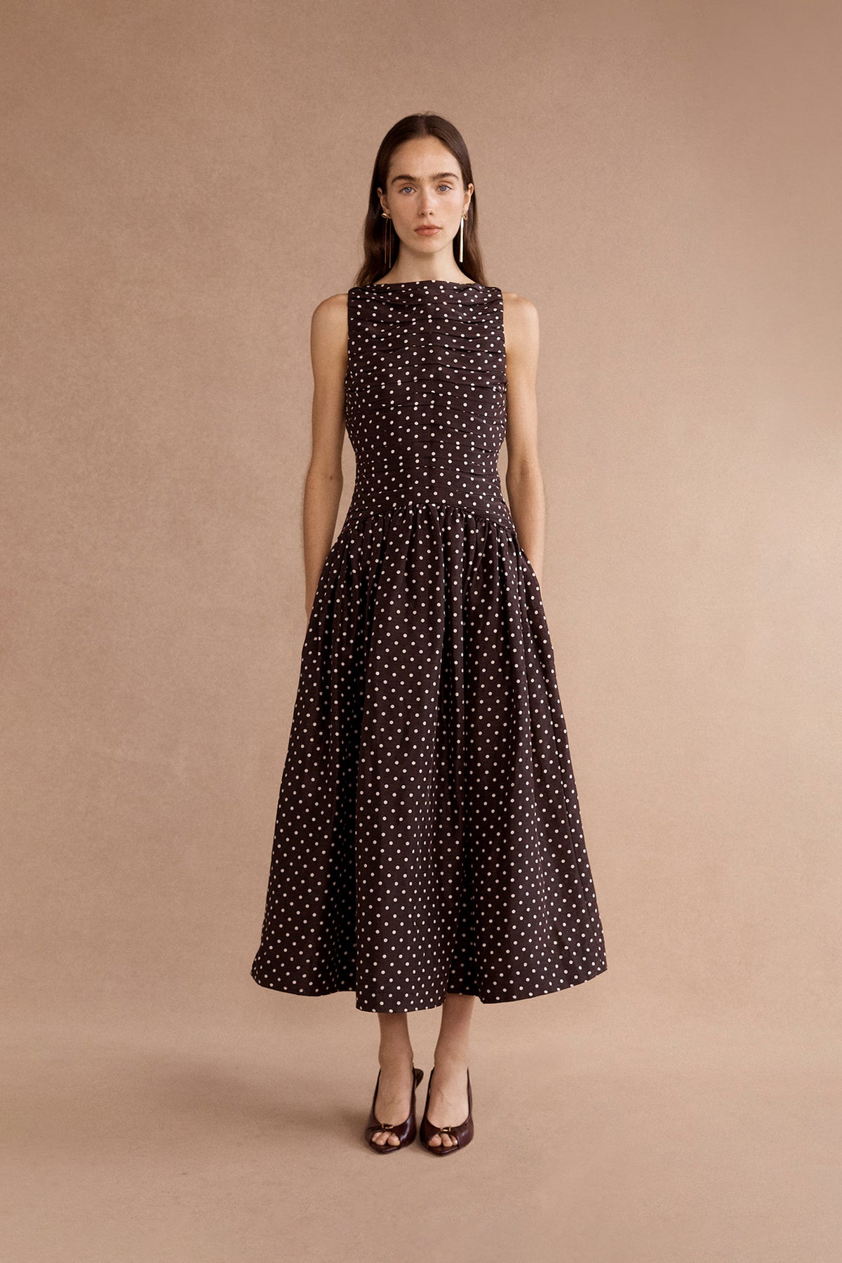 The best party dresses invite unrestricted movement; the Val dress is no exception. Cut from luxurious linen blend in a playful cacao spot, its full-length design flatters with ruching through the waist and a softly draped skirt. Just add signature jewellery and a blazer.