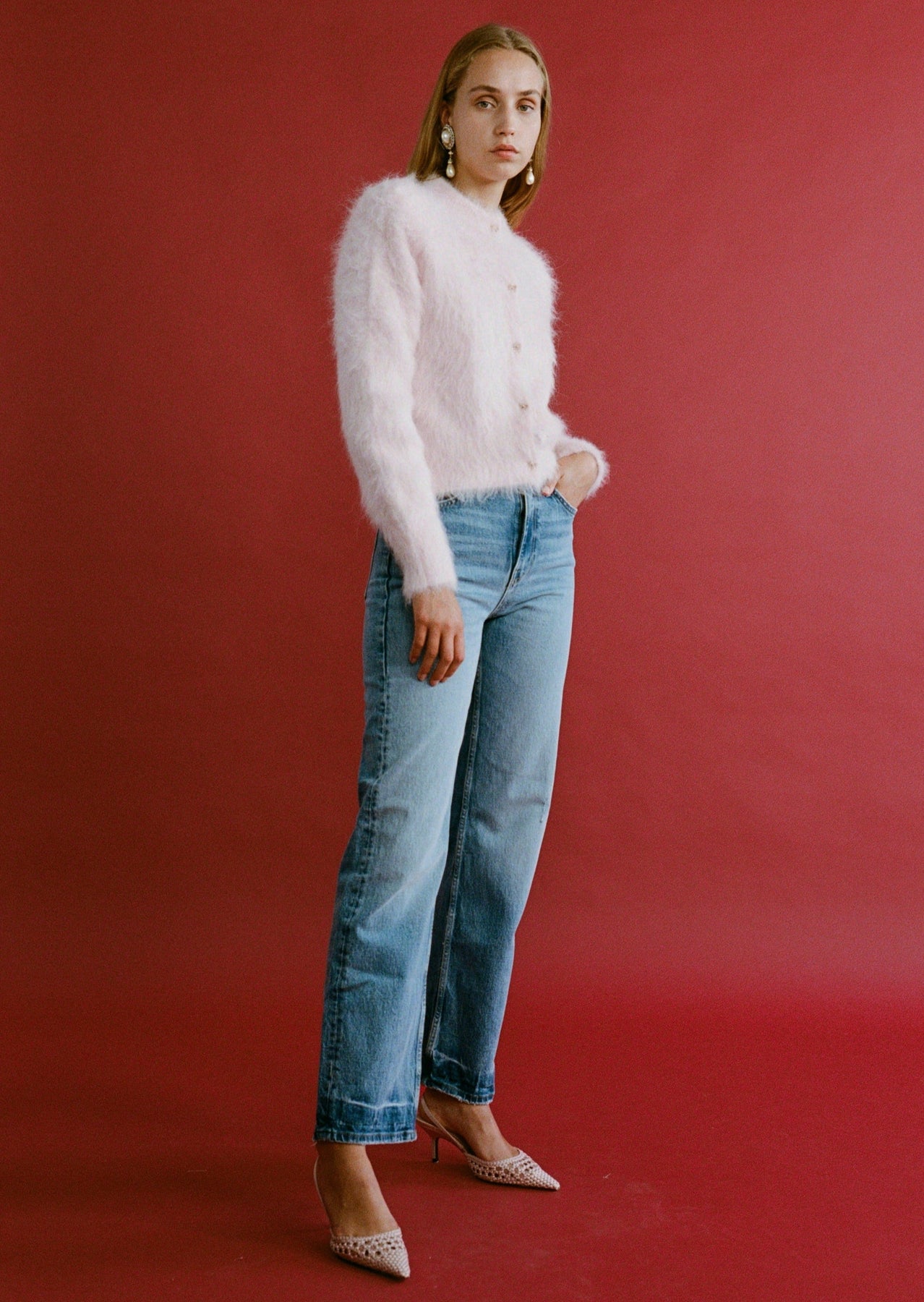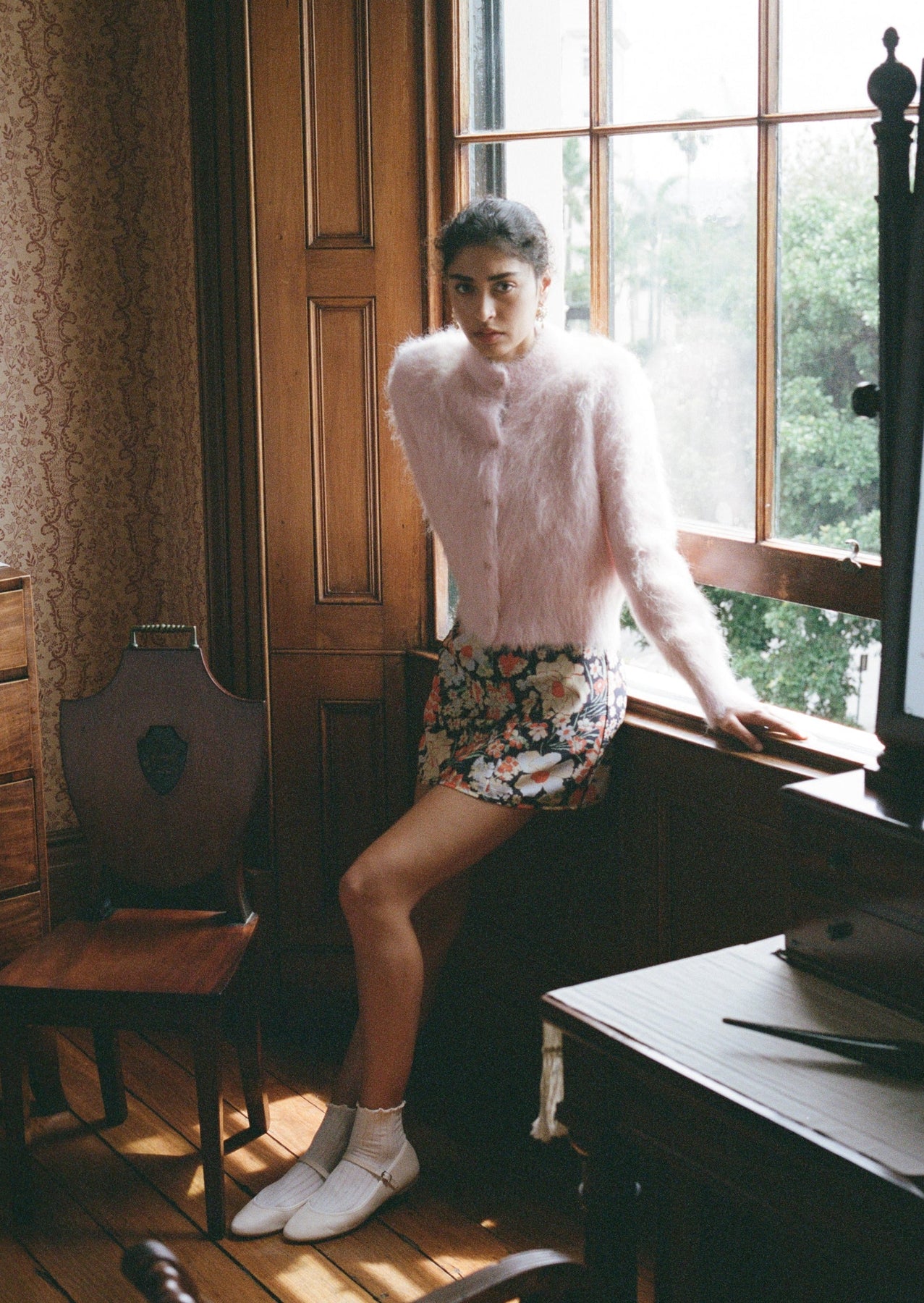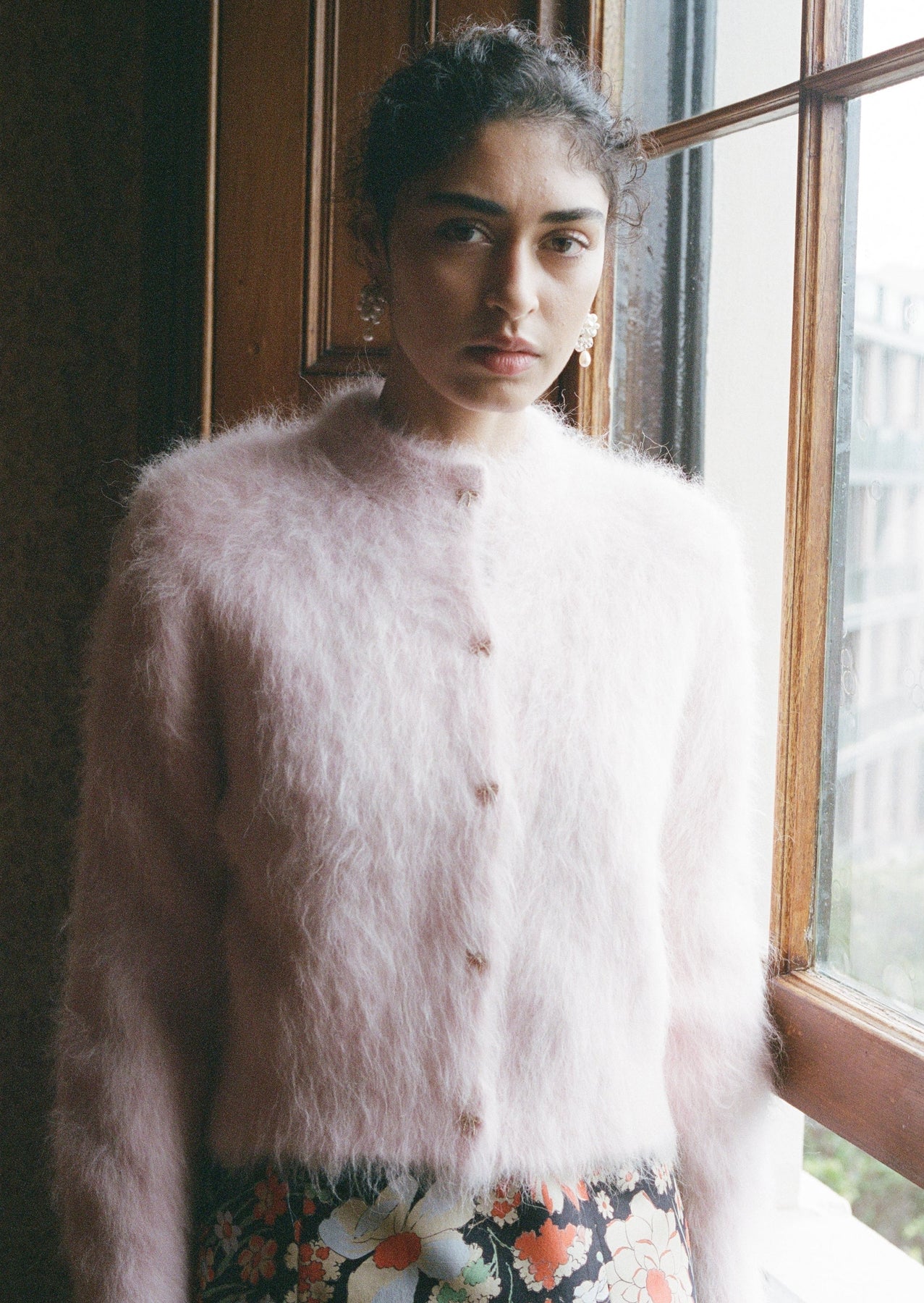 The Fleur cardigan in sherbet is a deliciously fluffy wardrobe staple to be worn throughout the year. The design features a press-stud fastening at the front and is adorned with delicate gold bow buttons. Its high neckline sits snug against the neck, extending below the waist in a long crop. Give a wink to the 80s with removable shoulder pads or wear without for a more relaxed look.