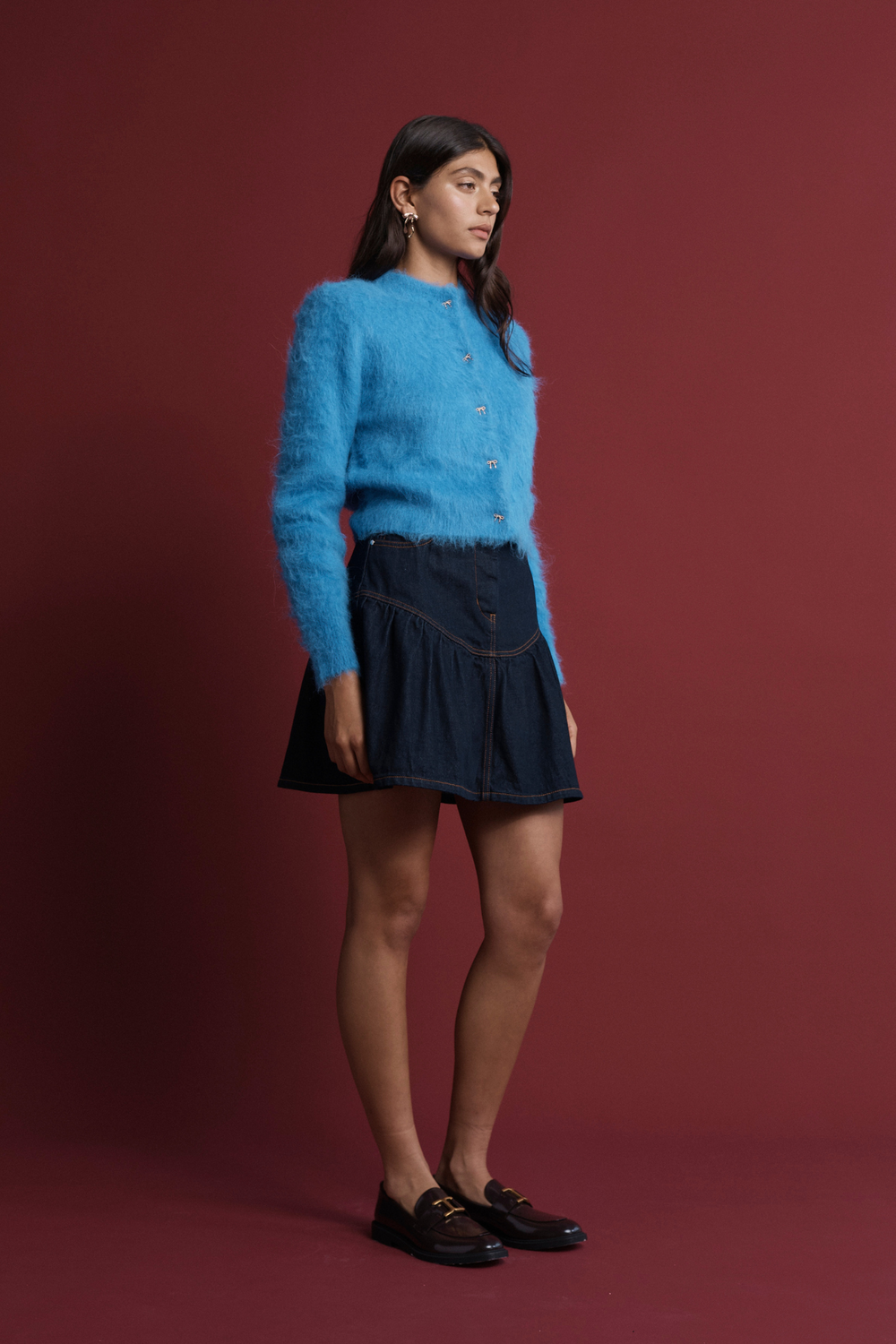 The Fleur cardigan in electric blue is a deliciously fluffy wardrobe staple to be worn throughout the year. The design features a press-stud fastening at the front and is adorned with delicate gold bow buttons. It's high neckline sits snug against the neck, extending below the waist in a long crop. Give a wink to the 80s with shoulder pads or remove them to wear without for a more relaxed look.