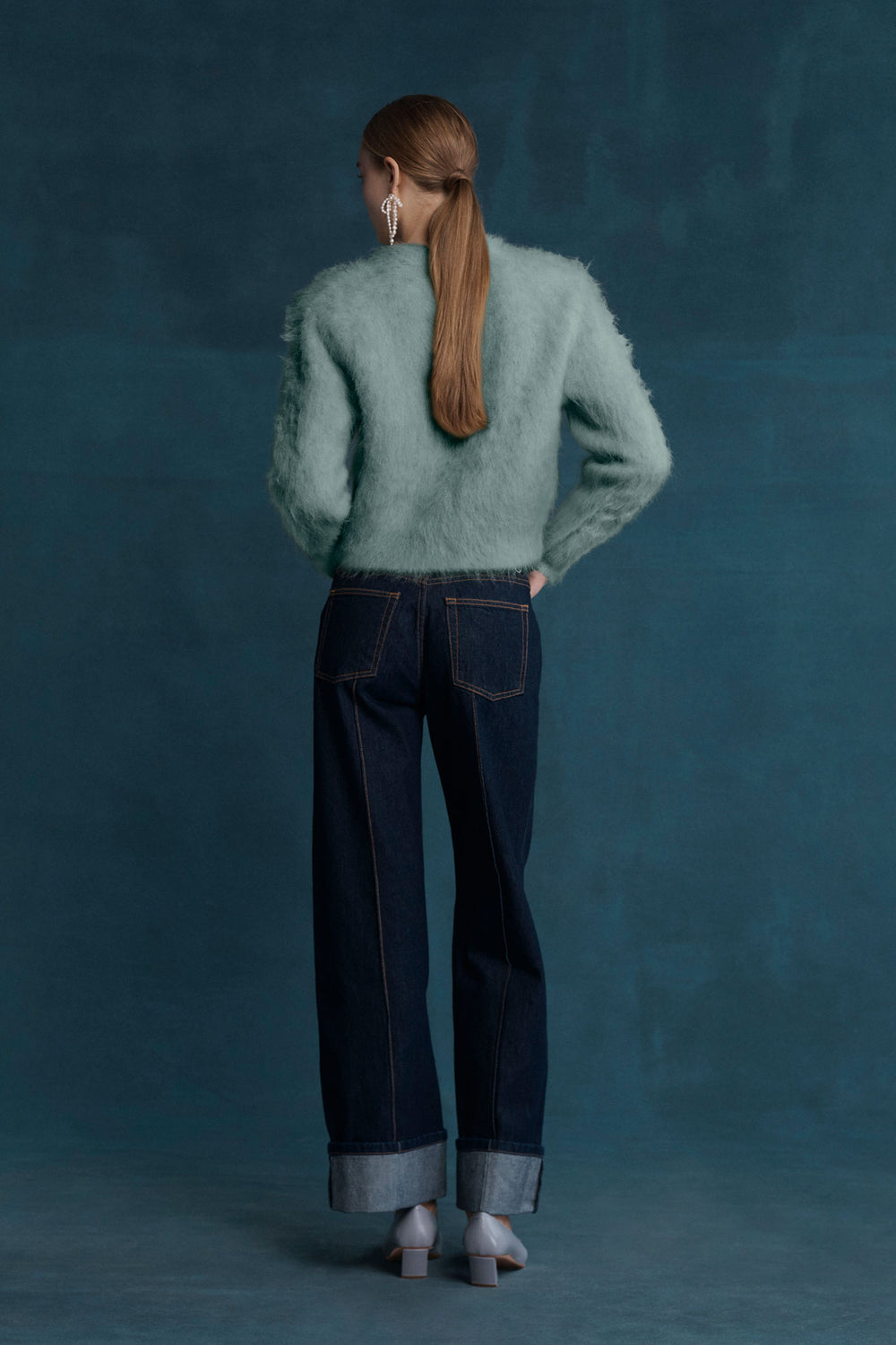 The Fleur cardigan in mint is a deliciously fluffy wardrobe staple to be worn throughout the year. The design features a press-stud fastening at the front and is adorned with delicate gold bow buttons. Its high neckline sits snug against the neck. Give a wink to the 80s with removable shoulder pads or wear without for a more relaxed look.