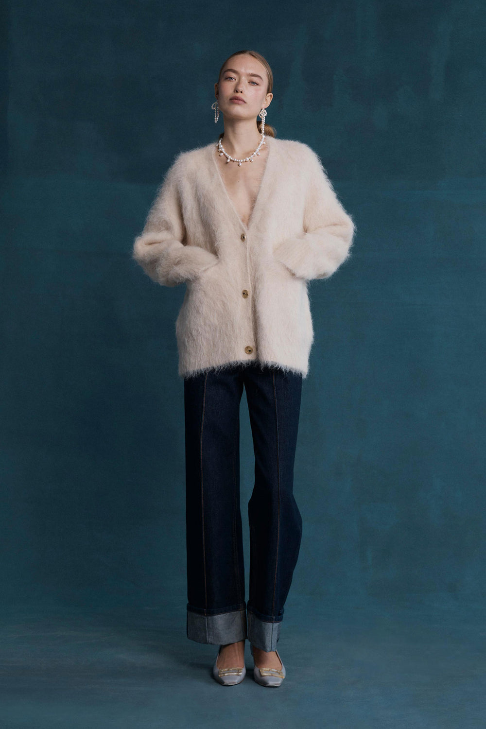 Fluffy goodness in cardigan form, the Hailey jumper in pearl features a functional button-down centre front, gold-rimmed tortoiseshell-style buttons and a boxy fit. The perfect piece to have fun with layering in the colder months or to wear on its own throughout Autumn and Spring, this cardigan is your next staple knitwear item.