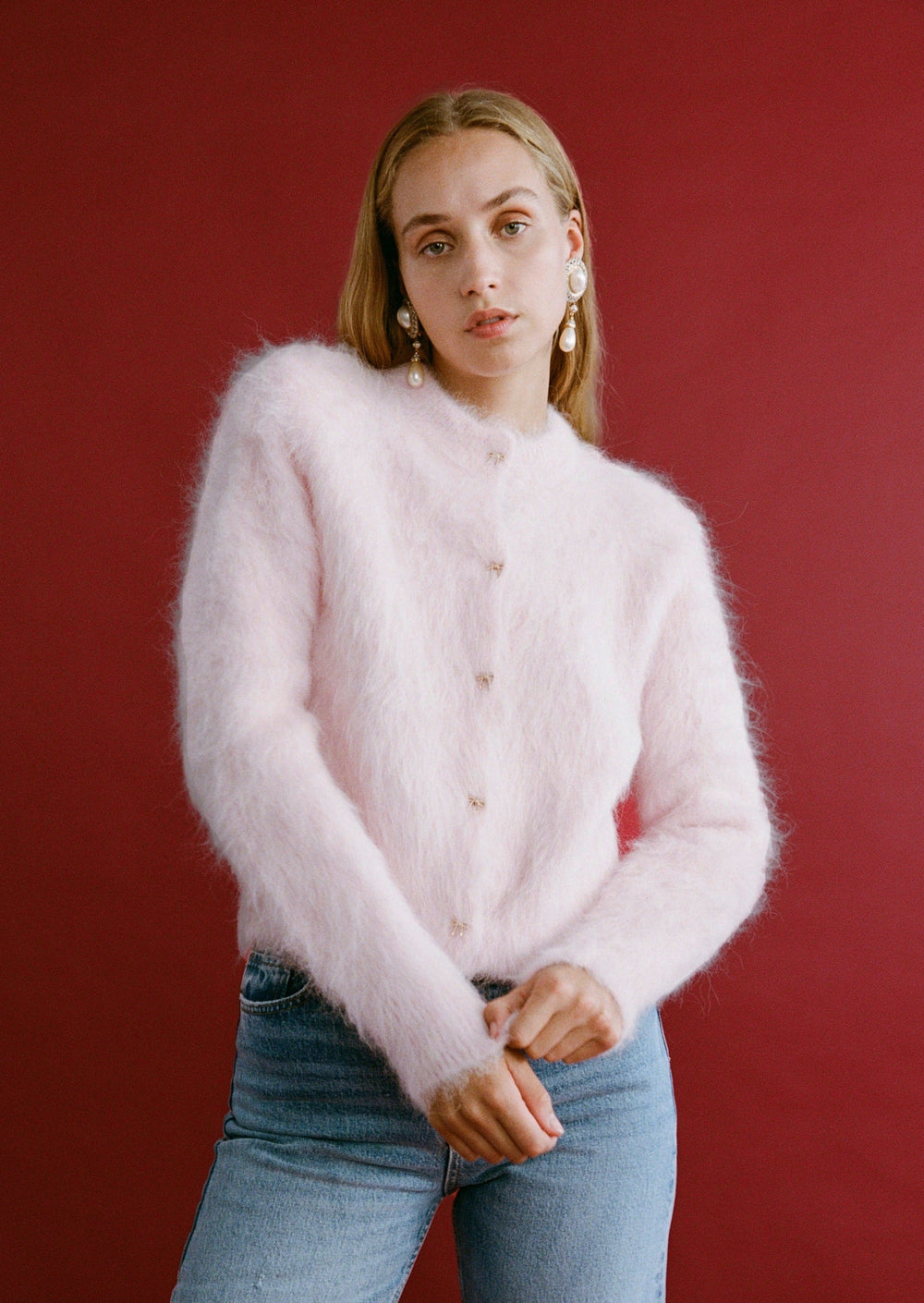 The Fleur cardigan in sherbet is a deliciously fluffy wardrobe staple to be worn throughout the year. The design features a press-stud fastening at the front and is adorned with delicate gold bow buttons. Its high neckline sits snug against the neck, extending below the waist in a long crop. Give a wink to the 80s with shoulder pads or remove them to wear without for a more relaxed look.