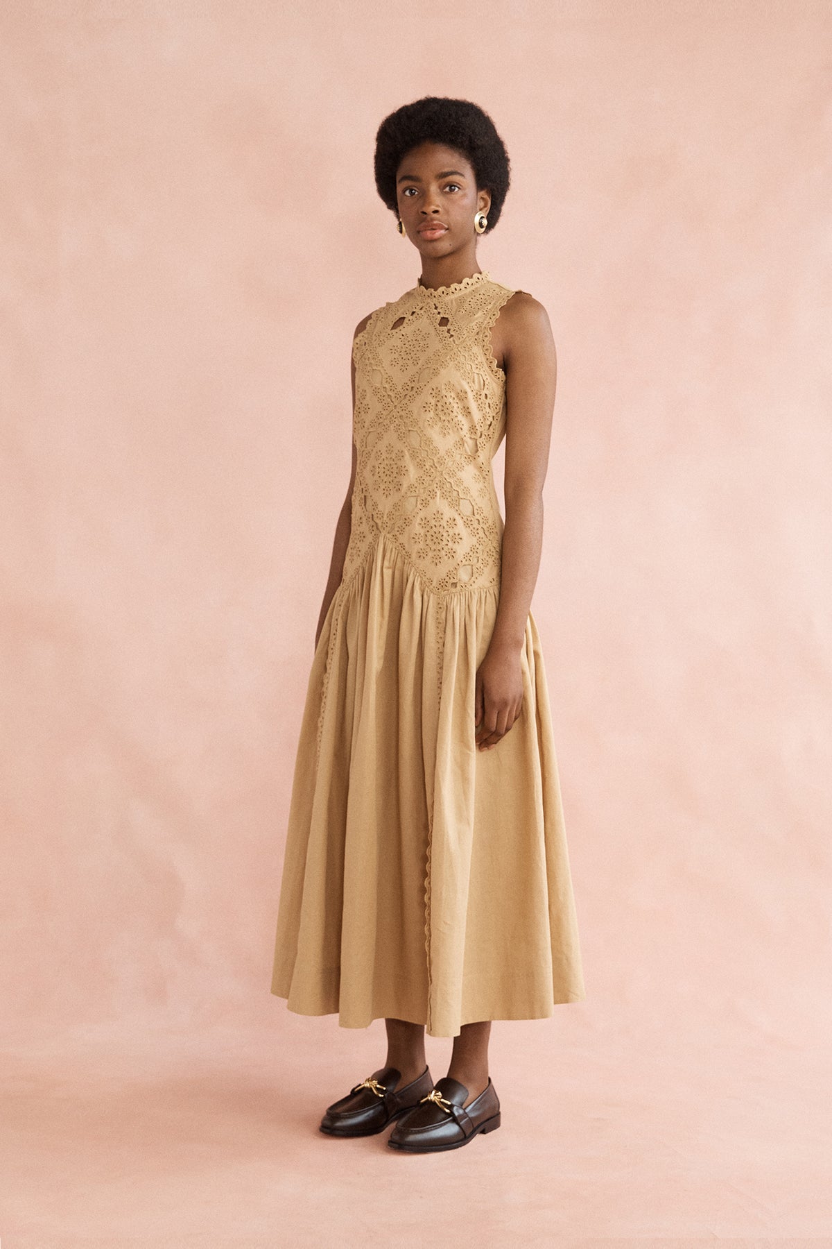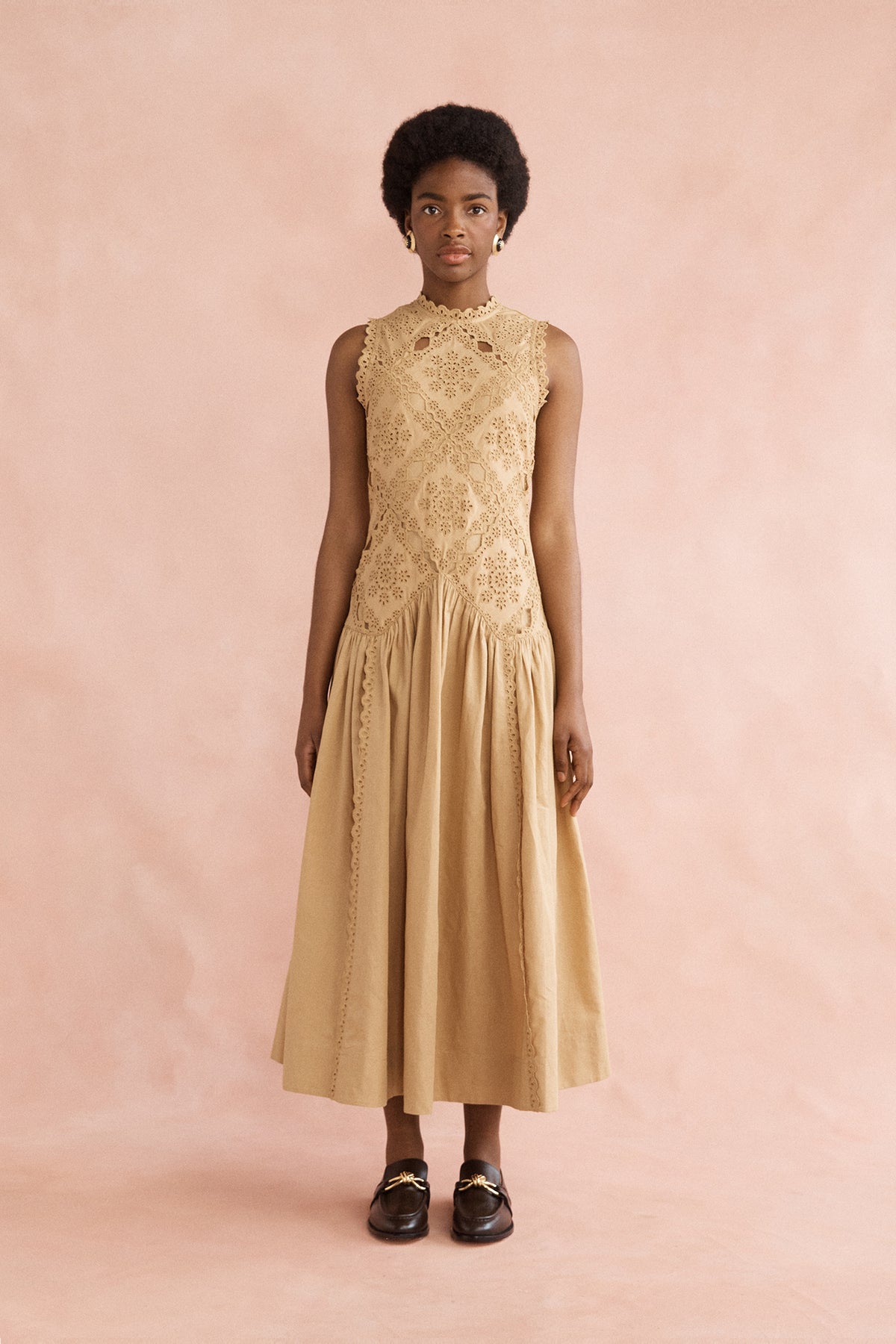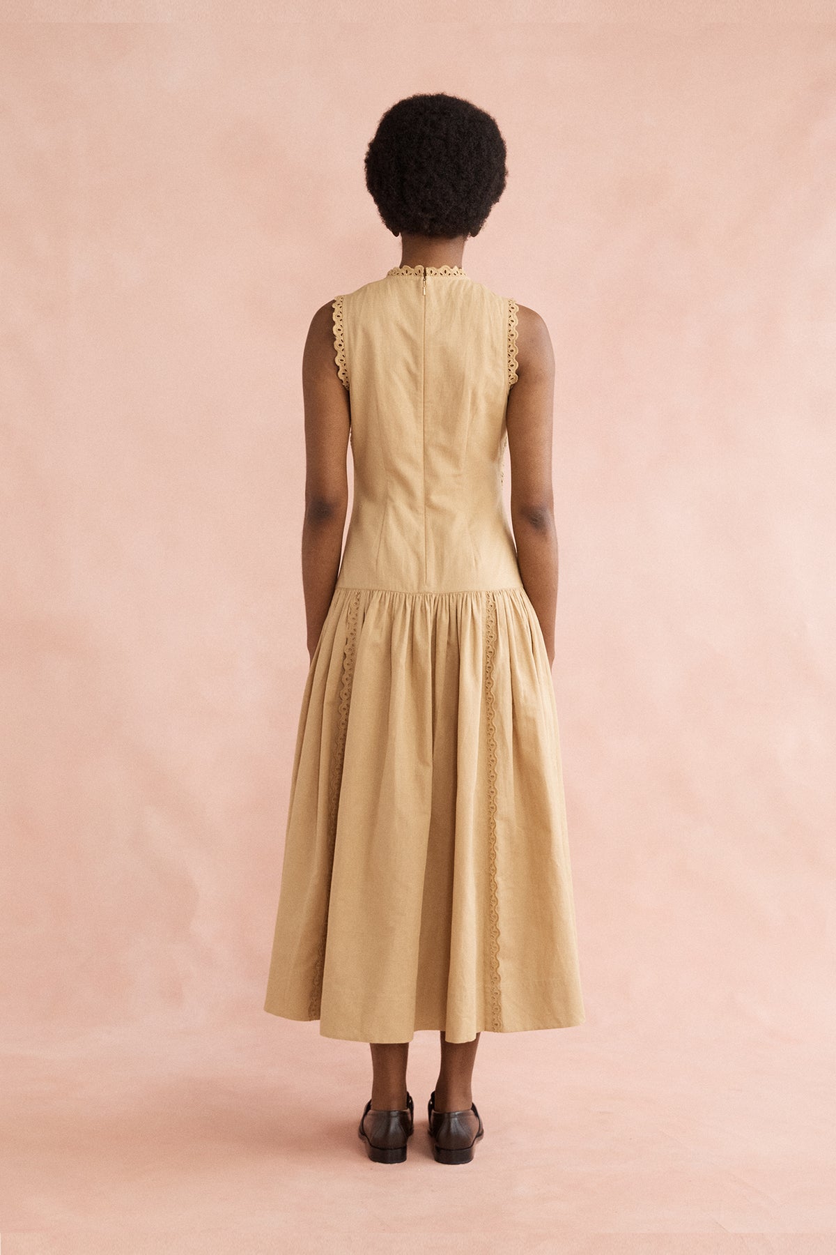 Free dry cleaning, shipping & returnThe Josephine midi dress in tan is a refined, sleeveless silhouette crafted from a cotton-linen blend, celebrating craftsmanship and quiet detail. Embroidered panels inspired by vintage doilies bring texture and sentiment, while the softly gathered skirt lends ease and movement.