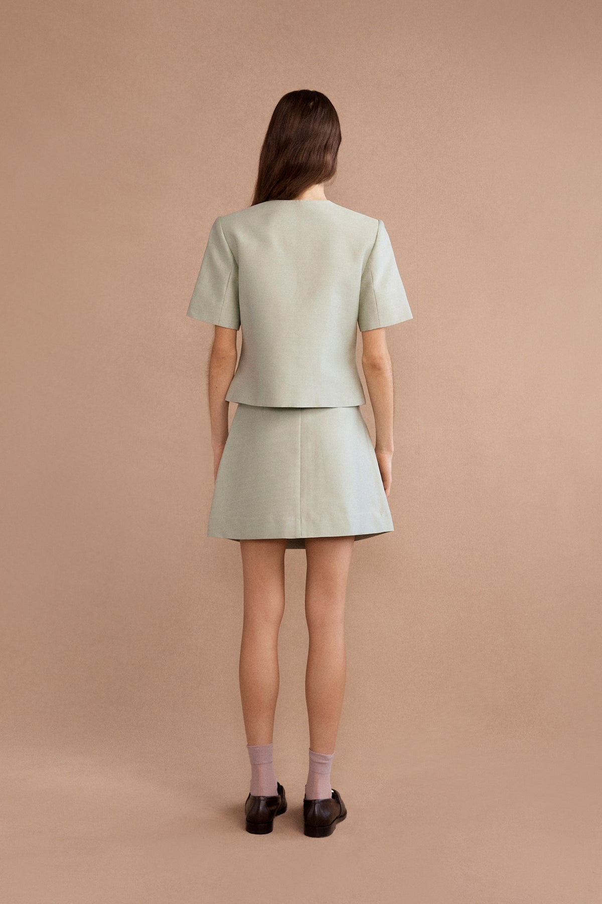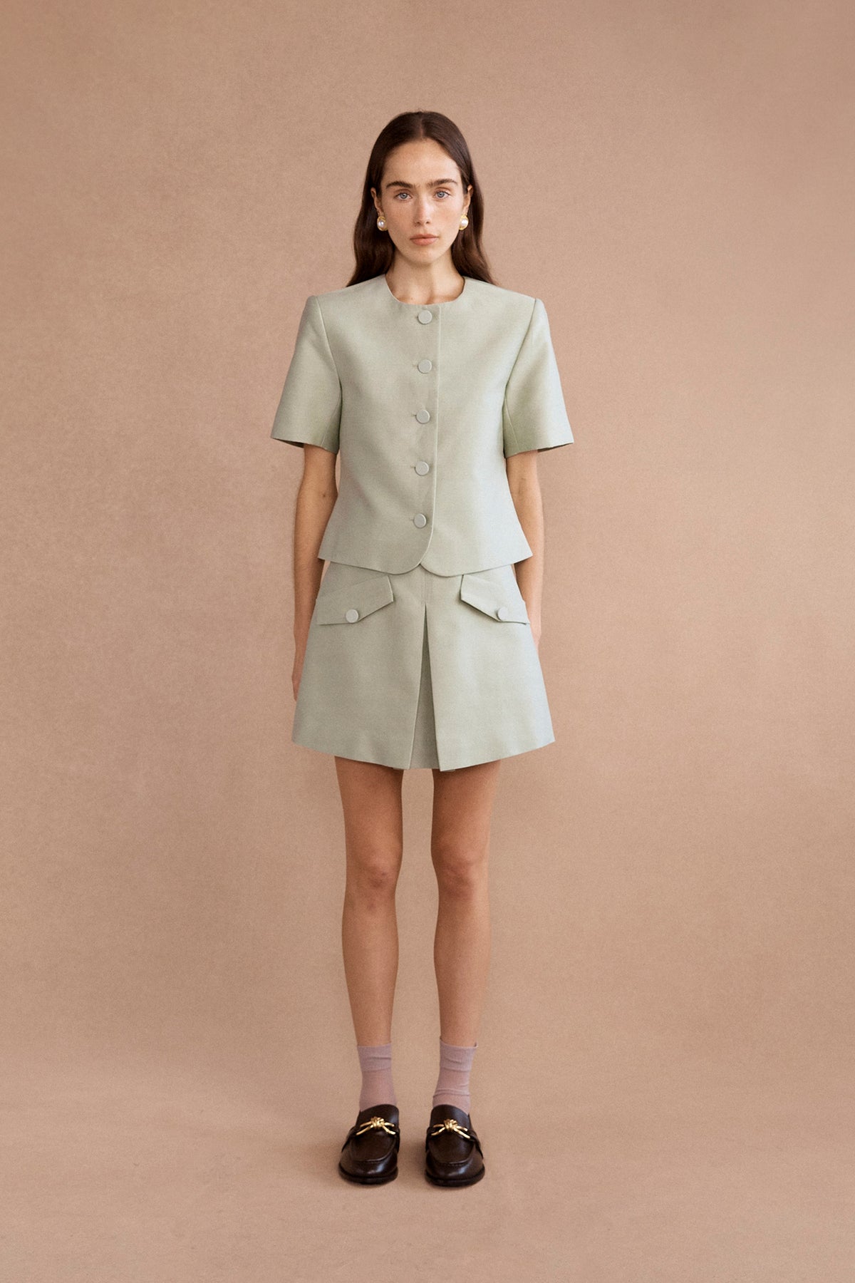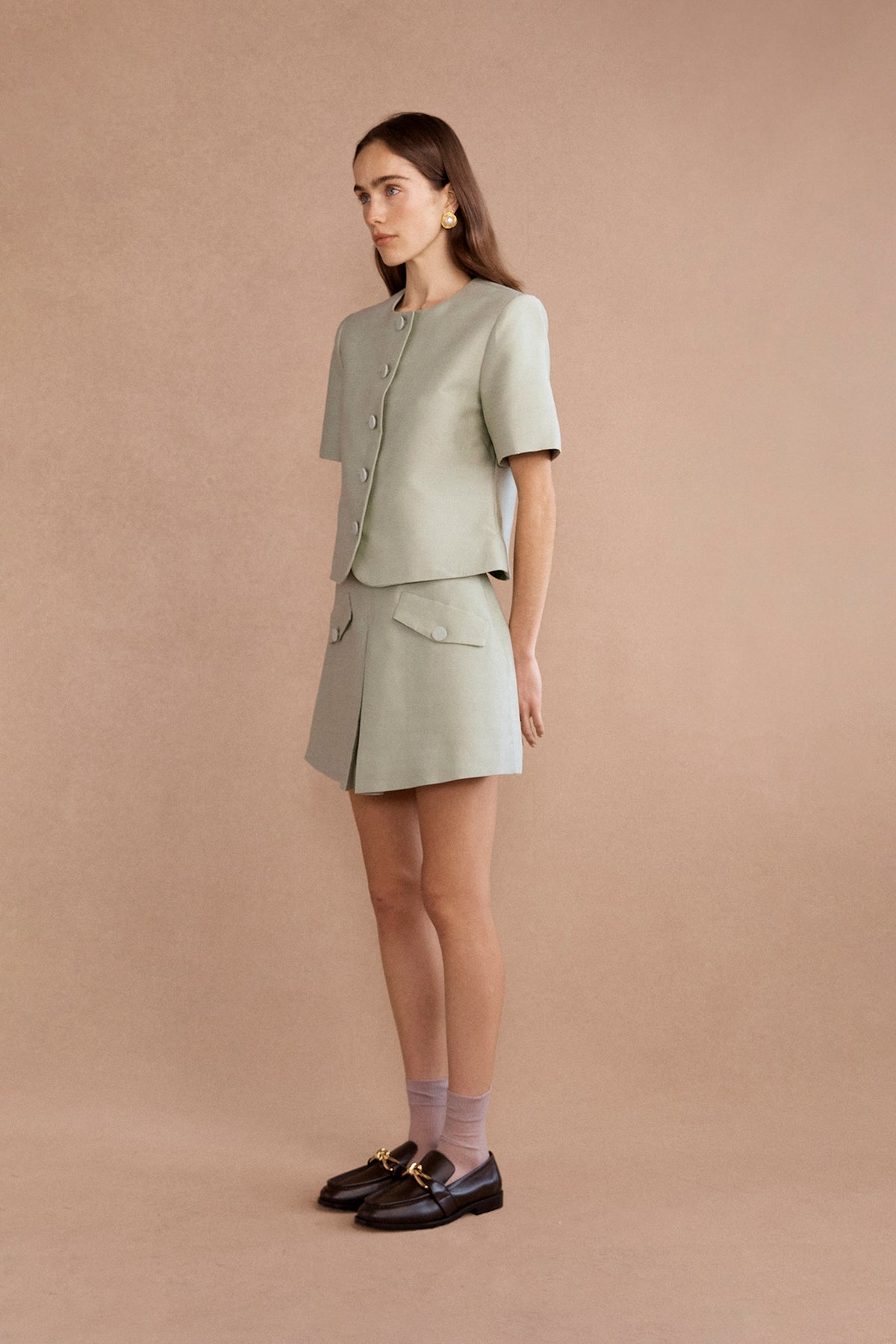 The Samira Blazer Top in Laurel is a modern take on structured elegance. With subtle shoulder pads, a boxy fit, and a button-down front, it exudes effortless sophistication. Style it with jeans for a casual, elevated look or pair with the Joanna Mini for a chic matching set.