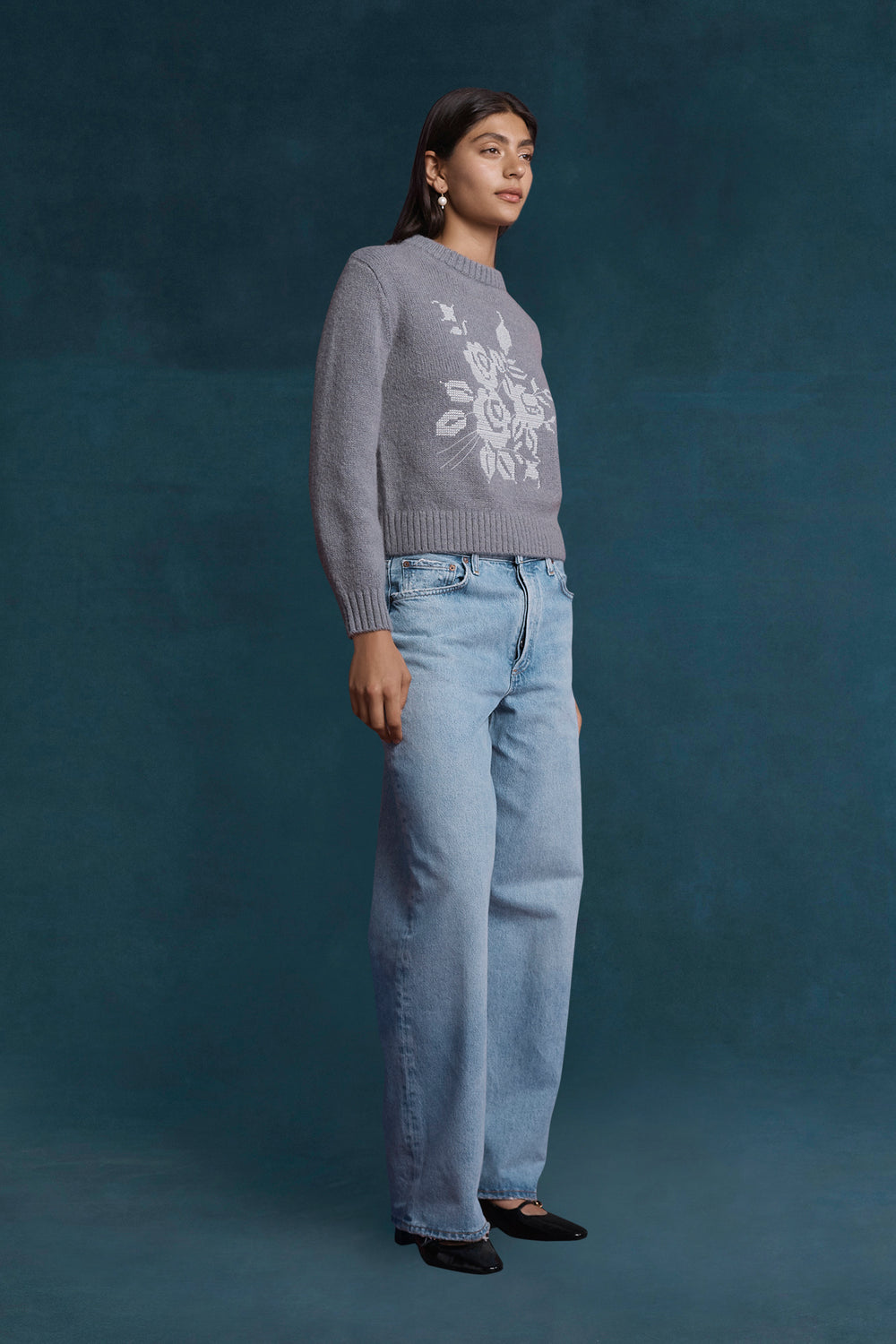 The Eloise jumper in grey, combines fun and flare to your wardrobe this winter. Featuring a floral motif across the front of the jumper in white, ribbed sleeve cuffs, neckline and hem, this knit is not only comfortable for any occasion, it's unique scrumptiousness stands out in any crowd.