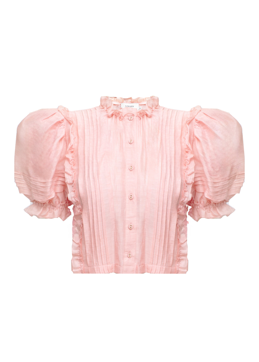 The Kaia top in macaron pink is feminine and luxurious in equal measure. In premium silk linen, the design features a button front, with optional buttons on the sides to tighten the fit. Puffy short sleeves are adorned with pin-tuck details and accentuated with elasticated cuffs. Wear it to a tea party with simple pants or a cute skirt.